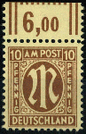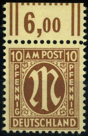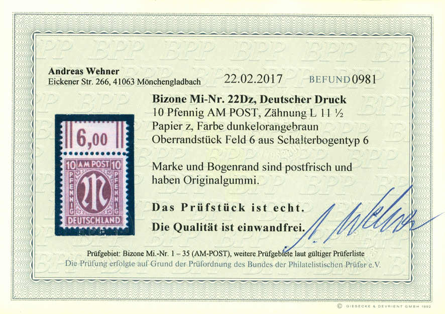 | Zusatzinformationen und Suchstichworte: | 75. AAK Phila GmbH Auktion 9. September 2022 Los 6642 (D) Bizone 10 Pf AM-Post in selt. Zähnung D v. OR, postfr. Luxus, Befund Wehner „echt u. einwandfrei” Ausruf 60,00 EUR |