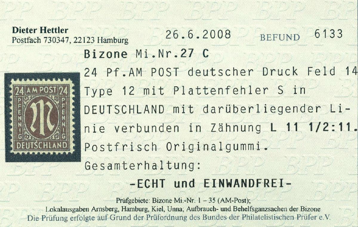 | Zusatzinformationen und Suchstichworte: | 75. AAK Phila GmbH Auktion 9. September 2022 Los 6664 (D) Bizone 24 Pf AM-POST in bester Zhg. m. PF "S m. Linie verbunden", postfr. Luxus m. einwandfreiem Befund Hettler BPP Ausruf 25,00 EUR |