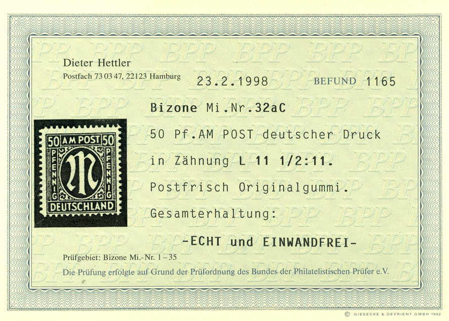 | Prüfer: | Hettler, Dieter (BPP (Bund Philatelistischer Prüfer)) |