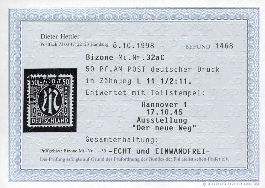 | Prüfer: | Hettler, Dieter (BPP (Bund Philatelistischer Prüfer)) |