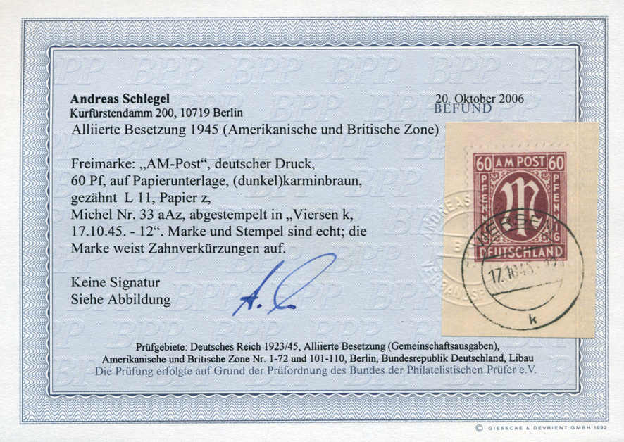 | Prüfer: | Schlegel, Andreas (BPP (Bund Philatelistischer Prüfer)) |