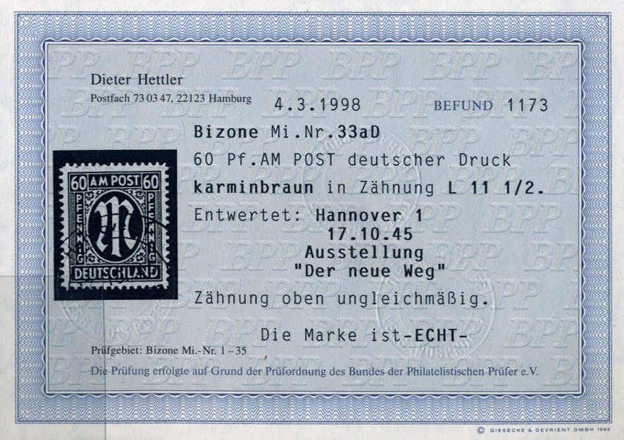| Prüfer: | Hettler, Dieter (BPP (Bund Philatelistischer Prüfer)) |