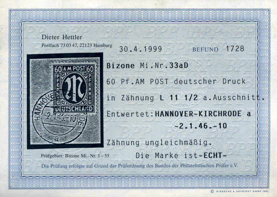 | Prüfgebiet: | Alliierte Besetzung Bizone |