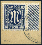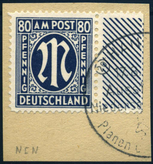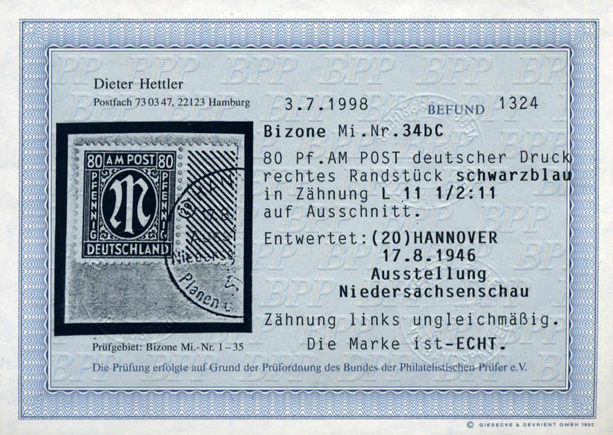 | Zusatzinformationen und Suchstichworte: | 75. AAK Phila GmbH Auktion 9. September 2022 Los 6724 (D) Bizone 80 Pf AM-Post in zweitbester Type v. re.Rand a. Pracht-Bfstck. m. SST Hannover m. Befund Hettler BPP "echt, li. Zhg. ungleichmäßig", sehr schönes Stück! RR Zuschlag 310,00 EUR |