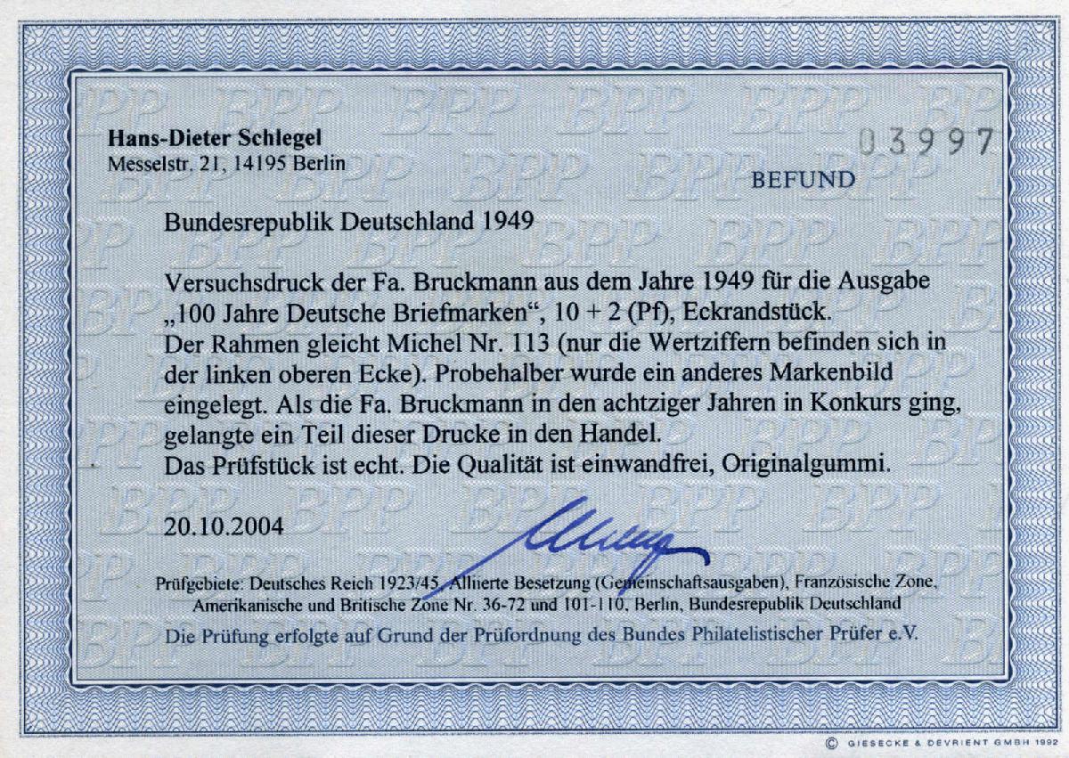 | Zusatzinformationen und Suchstichworte: | 75. AAK Phila GmbH Auktion 9. September 2022 Los 9063 (D) Bundesrepublik Deutschland 1949 Versuchsdruck der Fa. Bruckmann für die Ausgabe "100 J. dt. Briefmarken",10+2 Pf, Rahmen ähnlich der Mi. 113, Ecke li.u., postfr. Luxus m. einwandfreiem FB Schlegel BPP Ausruf 50,00 EUR |