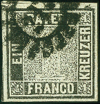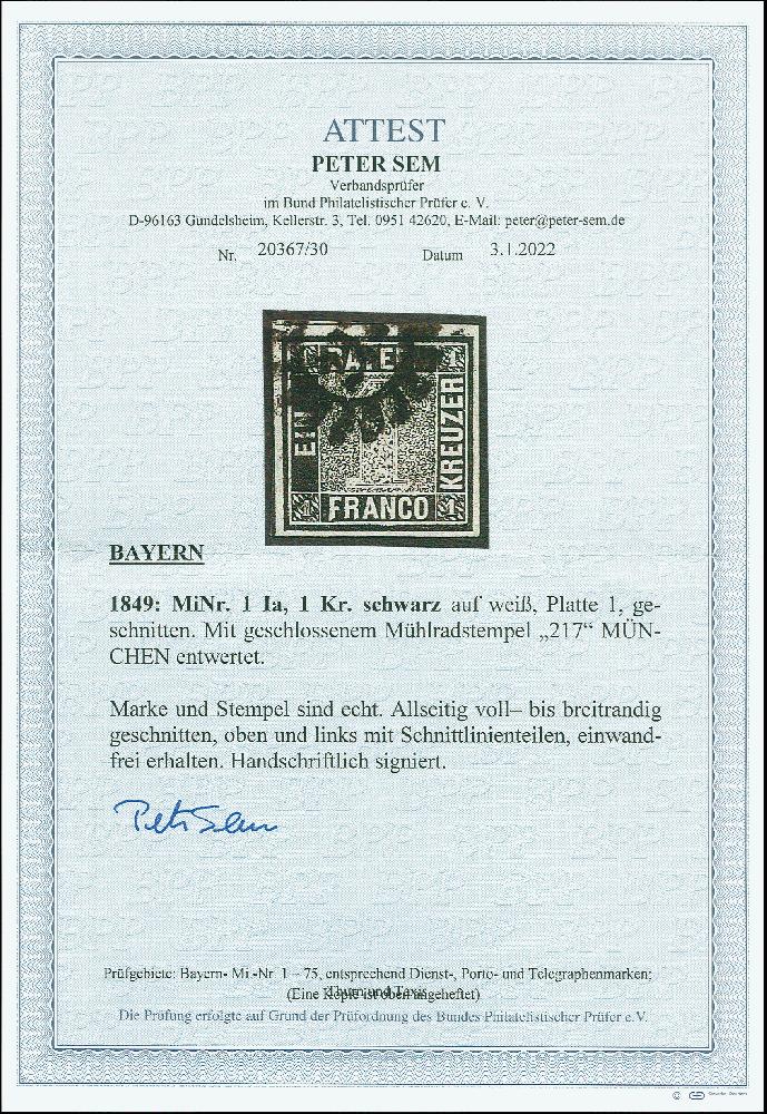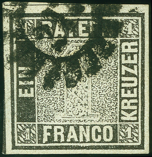 | Zusatzinformationen und Suchstichworte: | 378. Auktion Heinrich Köhler 21.-26. März 2022 Los 7007 1 Kreuzer schwarz, Platte I, voll-bis breitrandig und farbfrisch mit Druck Zufälligkeit „langes F“, sauber entwertet durch gMR „217“ MÜNCHEN, tadellos. Fotoattest Sem BPP (2022) Zuschlag 1.000,00 EUR |