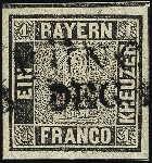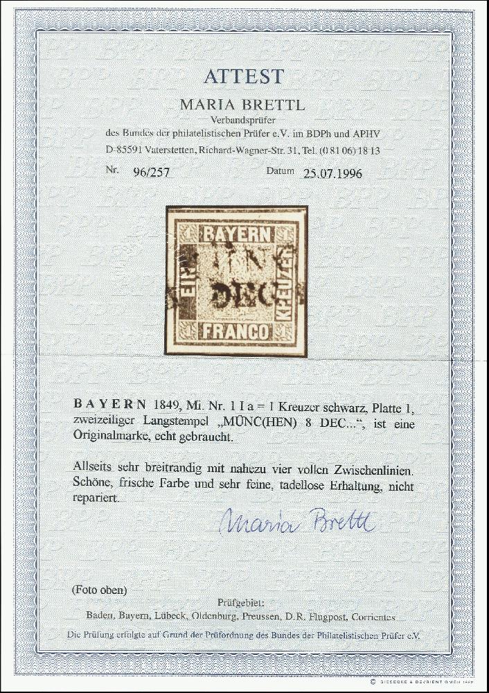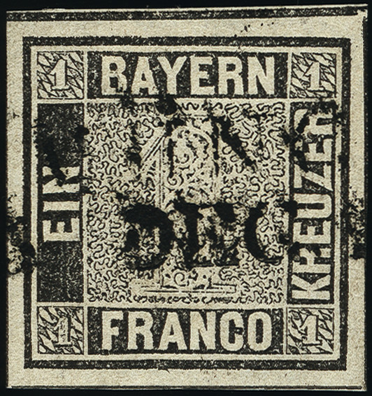 | Zusatzinformationen und Suchstichworte: | 378. Auktion Heinrich Köhler 21.-26. März 2022 Los 7008 1 Kreuzer schwarz, Platte 1, farbfrisch und allseits breitrandig mit nahezu allen Zwischenlinien, sauber entwertet durch Langstempel von München, tadellos. Fotoattest Brettl BPP (1996) Zuschlag 1.200,00 EUR |