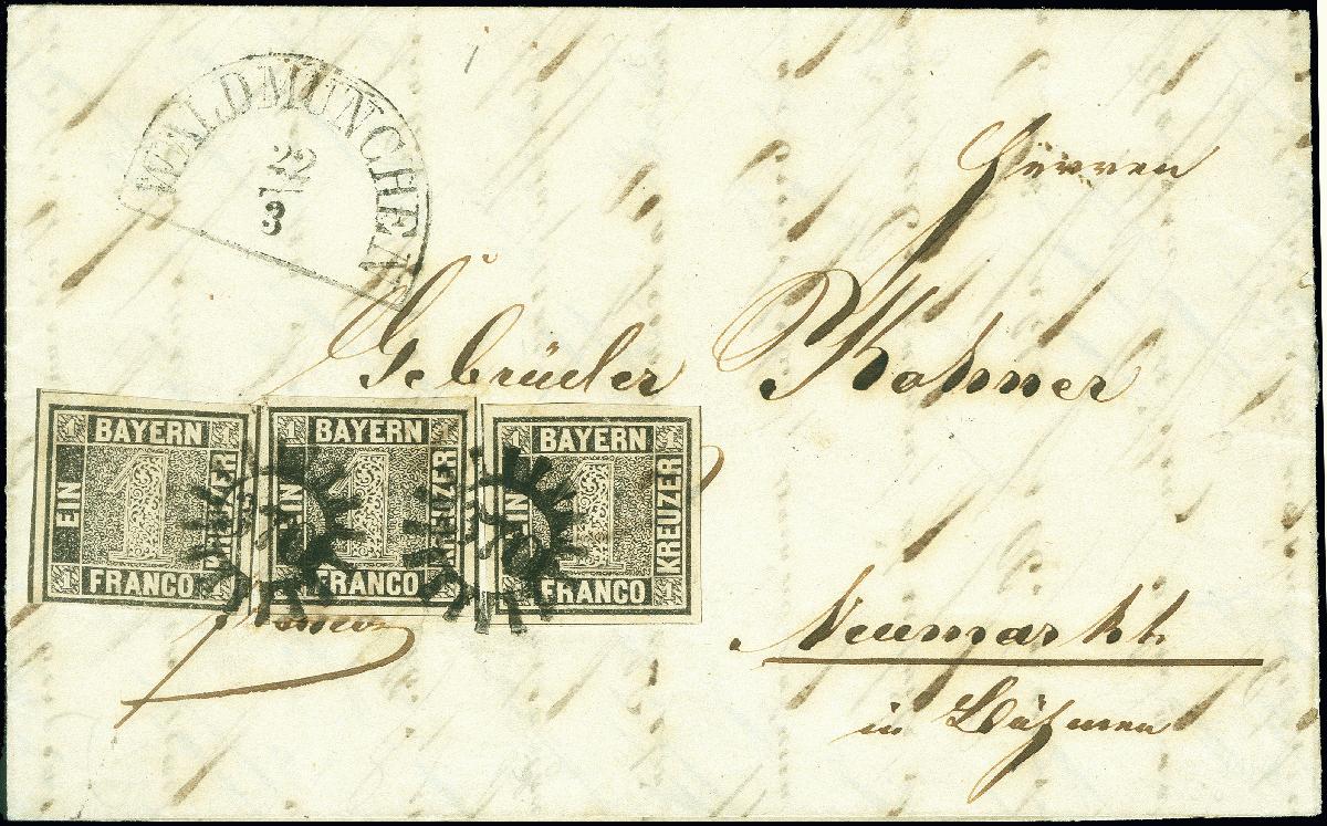 | Zusatzinformationen und Suchstichworte: | 378. Auktion Heinrich Köhler 21.-26. März 2022 Los 7010 1 Kreuzer schwarz, Platte 1, 3 Einzelwerte, einer voll-bis breitrandig, die anderen beiden allseits breit-bis überrandig und alle farbfrisch, mit zweimal sauber aufgesetztem gMR „370“ auf komplettem Faltbrief mit sauber nebengesetztem Halbkreis „WALDMÜNCHEN 22/3“ nach Neumarkt in Böhmen mit Ankunftsstempel von Neugedein. Sehr schöne einwandfreie und ursprüngliche Erhaltung (bei zwei Werten die Tinte der Beschriftung teils etwas durchschlagend). Ein attraktiver und außerordentlich seltener Brief. Wir haben nur eine weitere Mehrfachfrankatur der Nummer 1 auf Brief in den Postverein registriert, im Wechselverkehr mit Österreich ein einmaliges Stück. Signiert Friedl, Wien und Hunziker mit Fotoattest (1962); Fotoattest Stegmüller BPP (2022) Zuschlag 20.000,00 EUR |