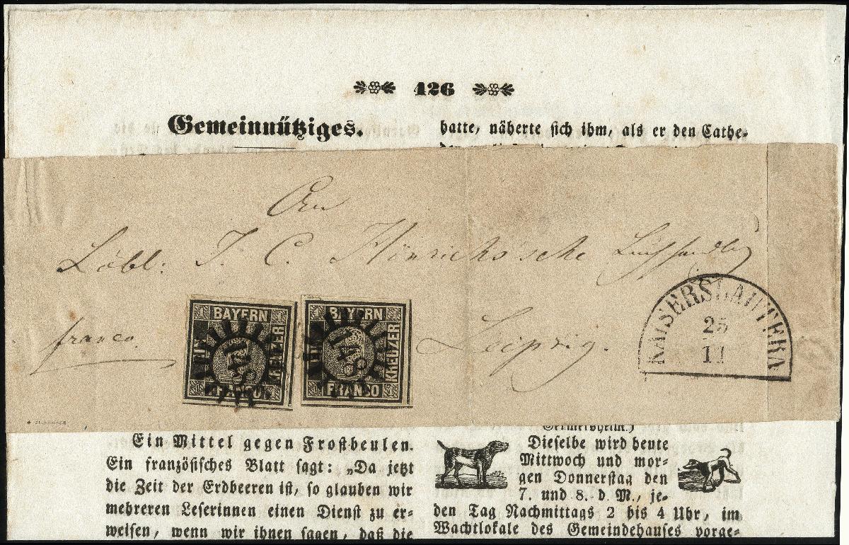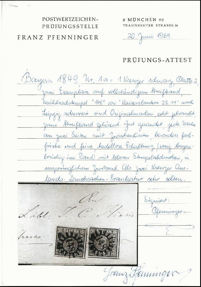 | Zusatzinformationen und Suchstichworte: | 378. Auktion Heinrich Köhler 21.-26. März 2022 Los 7018 1 Kreuzer schwarz, Platte 2, zwei Einzelwerte, beide voll- bis meist beitrandig, teils mit Zwischenlinien, mit gMR "148" auf Drucksachenschleife der 2. Gewichtsstufe (Inhalt aus optischen Gründen ergänzt) mit leicht nebengesetztem Halbkreis "KAISERSLAUTERN 25/11" nach Leipzig mit Ankunftsstempel. 2 Kreuzer-Frankaturen der Nr. 1 sind allererste Seltenheiten; in den Postverein haben wir keine weitere registriert. Ein ganz außergewöhnliches Stück in sehr schöner und einwandfreier Erhaltung. Fotoatteste Pfenninger (1969) und Schmitt BPP (2003) Zuschlag 36.000,00 EUR |