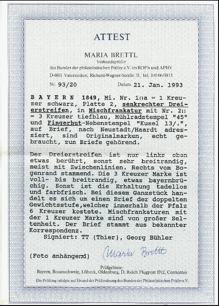 | Zusatzinformationen und Suchstichworte: | 378. Auktion Heinrich Köhler 21.-26. März 2022 Los 7019 1 Kreuzer schwarz, Platte 2, senkrechter 3er-Streifen, links oben minimal berührt, sonst voll- bis breitrandig, meist mit Zwischenlinien, aus der rechten oberen Bogenecke stammend, in Mischfrankatur mit 1850, 3 Kreuzer blau, Platte 2, voll- bis breitrandig, mit gMR "45" auf Briefhülle mit leicht nebengesetztem Fingerhutstempel "KUSEL 13/3" (1851) nach Neustadt a.d. Haardt. Schöne und sonst tadellose Erhaltung. Mischfrankaturen des ‚Schwarzen Einsers‘ gehören zu den großen Seltenheiten der Bayern-Philatelie; dies ist die einzige aus der bayerischen Pfalz und eine von nur drei bekannten Kombinationen mit einem Dreierstreifen der Nr. 1. Signiert Thier und Georg Bühler sowie Fotoatteste Brettl BPP und Schmitt BPP (beide 1993) Zuschlag 50.000,00 EUR |