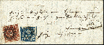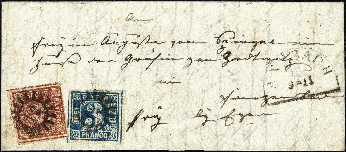| Zusatzinformationen und Suchstichworte: | 378. Auktion Heinrich Köhler 21.-26. März 2022 Los 7025 1849, 3 Kreuzer stumpfblau, Platte 1 in Mischfrankatur mit 1850, 6 Kreuzer rötlichbraun, beide farbfrisch und voll-bis breitrandig mit fast vollständigen Schnittlinien, mit klar aufgesetztem gMR "12" und nebengesetztem Halbkreis “ANSBACH 9=11“ (1850) auf kleinem Faltbrief nach Franzensbad bei Eger; tadellos. Eine sehr seltene und attraktive Kombination im Wechselverkehr mit Österreich. Signiert Brettl BPP mit Fotoattest (1990) Zuschlag 5.000,00 EUR |
