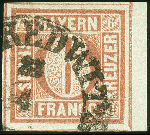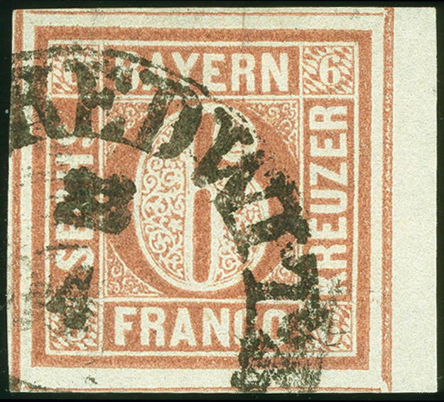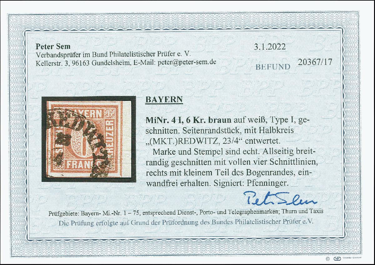 | Zusatzinformationen und Suchstichworte: | 378. Auktion Heinrich Köhler 21.-26. März 2022 Los 7027 1849, 6 Kreuzer braunorange, farbfrisch und allseits sehr breitrandig mit vollständigen Zwischenlinien und recht 2,5 mm Bogenrand, sauber entwertet durch Halbkreis "MKT.REDWITZ 23/4"; ein besonders schönes Stück in tadelloser Erhaltung. Signiert Pfenninger und Fotobefund Sem BPP (2022) Zuschlag 260,00 EUR |