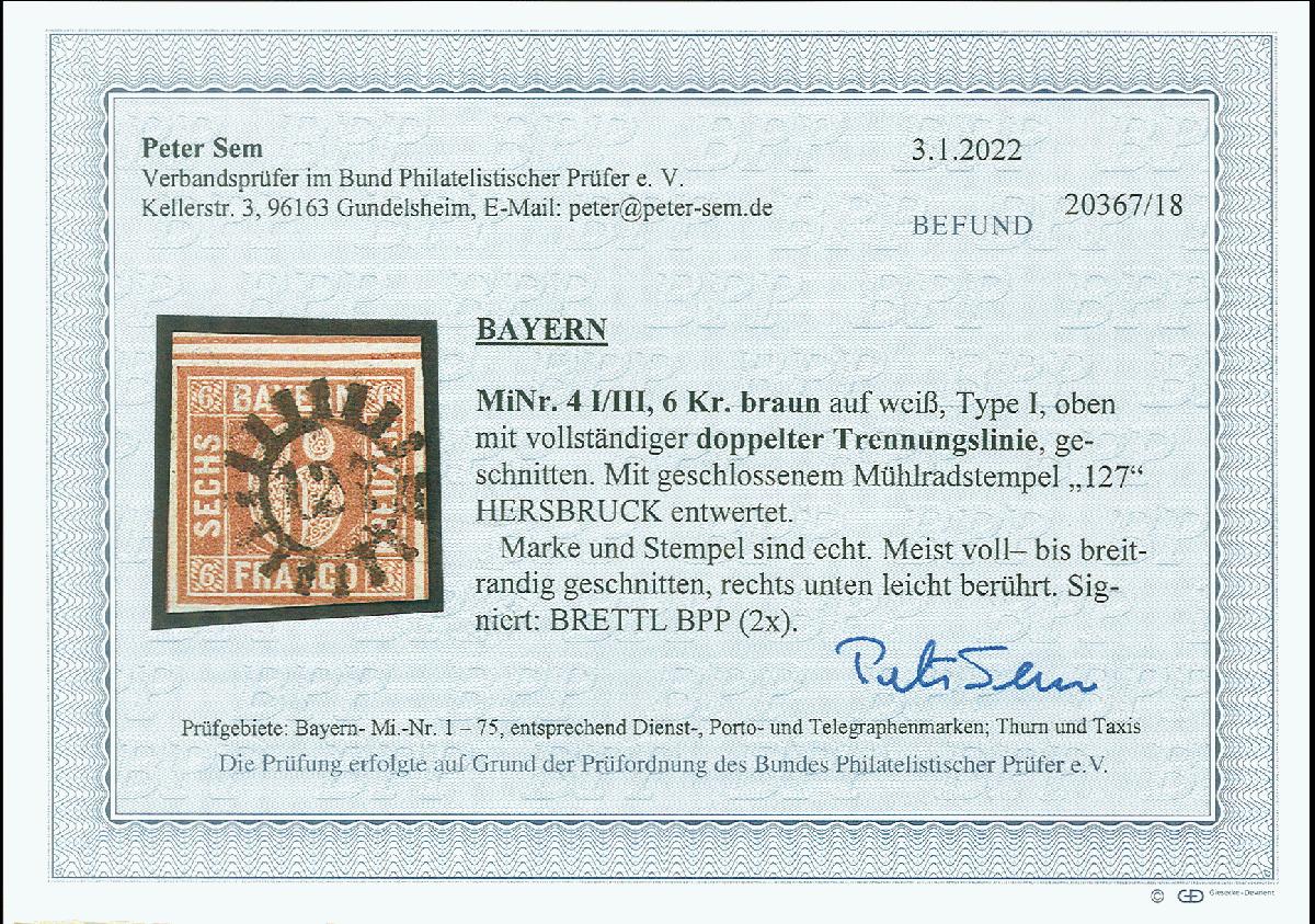| Zusatzinformationen und Suchstichworte: | 378. Auktion Heinrich Köhler 21.-26. März 2022 Los 7028 1849, 6 Kreuzer braunorange, oben mit vollständiger doppelter Trennungslinie, unten rechts kurz berührt, sonst voll-bis breitrandig und farbfrisch, sauber entwertet durch gMR "127" HERSBRUCK; seltenes Stück Stück in sonst tadelloser Erhaltung. Signiert Brettl BPP und Fotobefund Sem BPP (2022) Zuschlag 200,00 EUR |