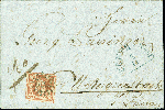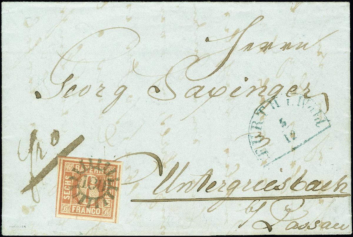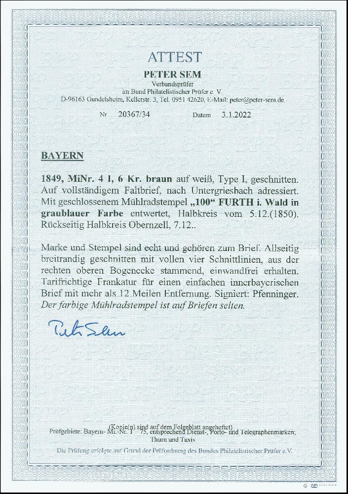 | Zusatzinformationen und Suchstichworte: | 378. Auktion Heinrich Köhler 21.-26. März 2022 Los 7031 6 Kreuzer braunorange, farbfrisch und allseits sehr breitrandig mit vollen vier Schnittlinien, mit klar aufgesetztem graublauem gMR „100“ und sauber nebengesetztem Halbkreis „FURTH i. Wald 5/12“ (1850), ebenfalls in blau, auf komplettem Faltbrief nach Untergriesbach bei Passau mit Durchgangsstempel von Obernzell. Ein sehr attraktiver und seltener Brief dieser Marke mit farbiger Entwertung. Signiert Pfenninger und Fotoattest Sem BPP (2022) Zuschlag 1.500,00 EUR |