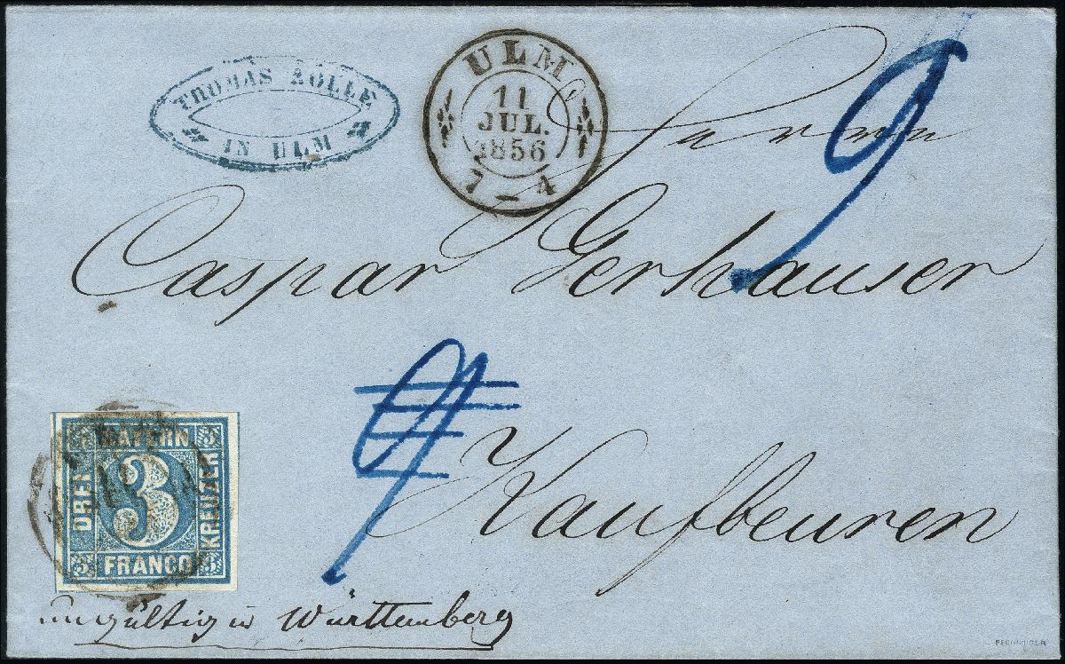| Zusatzinformationen und Suchstichworte: | 378. Auktion Heinrich Köhler 21.-26. März 2022 Los 7035 3 Kreuzer blau, Platte 5, allseits breitrandig und farbfrisch, mit übergehend aufgesetztem württembergischen Doppelkreisstempel "ULM 11 JUL 1856" auf komplettem Faltbrief nach Kaufbeuren. Handschriftlich neben der Marke “ungültig in Württemberg“ und mit “9“ Kreuzern nachtaxiert. Ein attraktiver, interessanter und seltener Brief. Signiert Pfenninger und Fotoattest Brettl BPP (2005) Zuschlag 2.900,00 EUR |