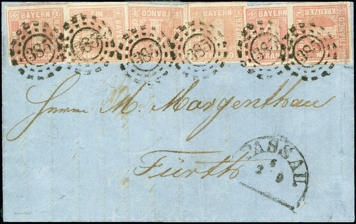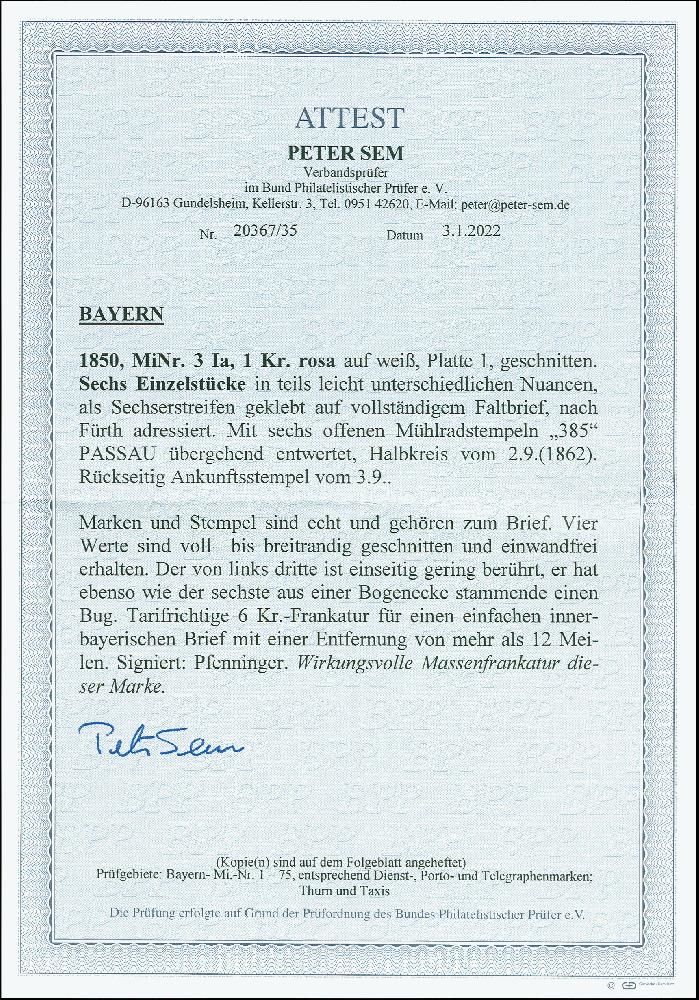 | Zusatzinformationen und Suchstichworte: | 378. Auktion Heinrich Köhler 21.-26. März 2022 Los 7041 1 Kreuzer rosa, sechs Einzelwerte in teils leicht unterschiedlichen Nuancen, alle farbfrisch und bis auf eine leicht berührte Stelle alle voll- bis breitrandig, mit jeweils sauber aufgesetztem gMR „385“ und nebengesetztem Halbkreis „PASSAU 2 9“ (1862) auf komplettem Faltbrief nach Fürth. Zwei Werte am Rand durch senkrechte Briefbüge getroffen, sonst einwandfrei. Eine attraktive und seltene Massenfrankatur. Signiert Pfenninger und Fotoattest Sem BPP (2022) Zuschlag 1.350,00 EUR |