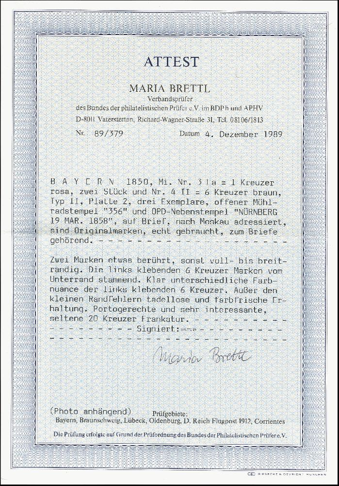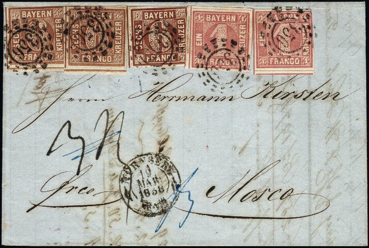 | Zusatzinformationen und Suchstichworte: | 378. Auktion Heinrich Köhler 21.-26. März 2022 Los 7042 1 Kreuzer rosa, 2 Einzelwerte zusammen mit 3 Einzelwerten 6 Kreuzer braun (2 deutlich unterschiedliche Nuancen), 2 Werte leicht berührt, sonst alle voll- bis breitrandig, zwei 6 Kreuzer vom unteren Bogenrand stammend, mit oMR "356" und nebengesetztem DKr. "NÜRNBERG 19 MAR 1858" auf komplettem Faltbrief nach Moskau. Das Weiterfranko mit "3" Silbergroschen vorder- und rückseitig vermerkt. Ein attraktiver und seltener Auslandsbrief mit ungewöhnlicher Frankatur-Kombination. Signiert Brettl BPP mit Fotoattest Zuschlag 1.600,00 EUR |