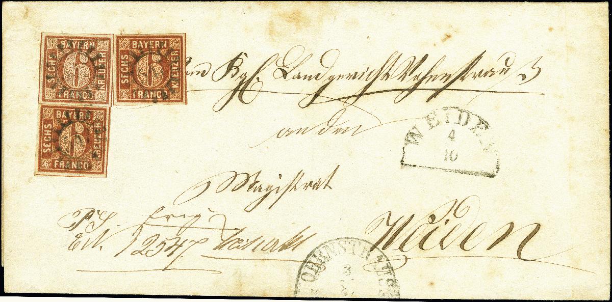 | Zusatzinformationen und Suchstichworte: | 378. Auktion Heinrich Köhler 21.-26. März 2022 Los 7048 6 Kreuzer braun, Type 2, Platte 2, drei Einzelwerte, alle farbfrisch und voll- bis breitrandig, teils mit Schnittlinien, mit jeweils leicht aufgesetztem oMR „547“ und nebengesetztem Halbkreis „VOHENSTRAUSS 3/10“ auf kompletter Briefhülle der 6. Gewichtsstufe nach Weiden, mit handschriftlichem Vermerk „Mit 1 Akt“. Die Hülle gering fleckig, sonst einwandfrei. Eine selten hohe innerbayerische Frankatur. Fotoattest Sem BPP (2022) Zuschlag 300,00 EUR |