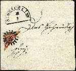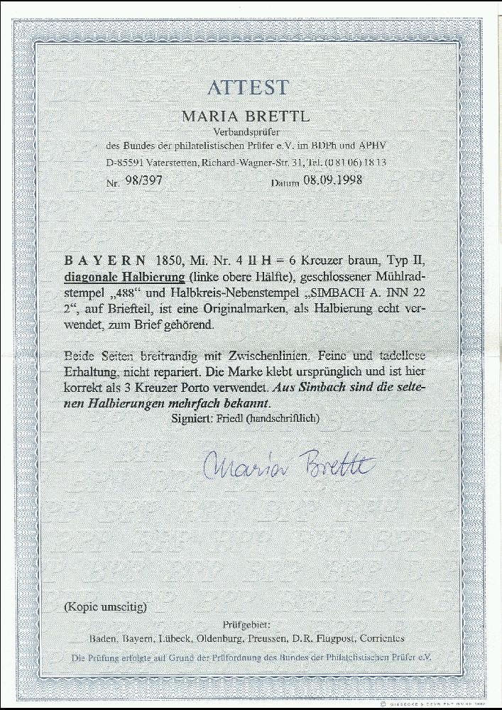 | Zusatzinformationen und Suchstichworte: | 378. Auktion Heinrich Köhler 21.-26. März 2022 Los 7049 6 Kreuzer rötlichbraun, diagonal halbiert, linke obere Hälfte, farbfrisch und breitbandig mit Zwischenlinien an beiden verbleibenden Seiten, mit klar aufgesetztem gMR „488“ und nebengesetztem Halbkreis “SIMBACH A.INN 22 2“ auf großem Teil einer Briefhülle. Sehr schöne frische und tadellose Erhaltung. Signiert Friedl mit Fotoattest Friedl expert committee (1950) und Fotoattest Brettl BPP (1998) Zuschlag 4.600,00 EUR |