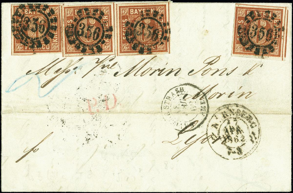 | Zusatzinformationen und Suchstichworte: | 378. Auktion Heinrich Köhler 21.-26. März 2022 Los 7050 6 Kreuzer braun, Type 2, Platte 3, vier Einzelwerte, alle farbfrisch und voll- bis breitrandig, teils mit Schnittlinien, mit jeweils sauber aufgesetztem oMR „356“ und nebengesetztem Doppelkreisstempel „NÜRNBERG 17 APR. 1862“ auf komplettem Faltbrief der 2. Gewichtsstufe nach Lyon. Der Brief ist portogerecht frankiert nach dem ab 1.7.1858 gültigen Vertrag. Eine in dieser Form ungewöhnliche und seltene 24 Kreuzer-Frankatur. Signiert Brettl BPP und Fotoattest Sem BPP (2022) Zuschlag 850,00 EUR |