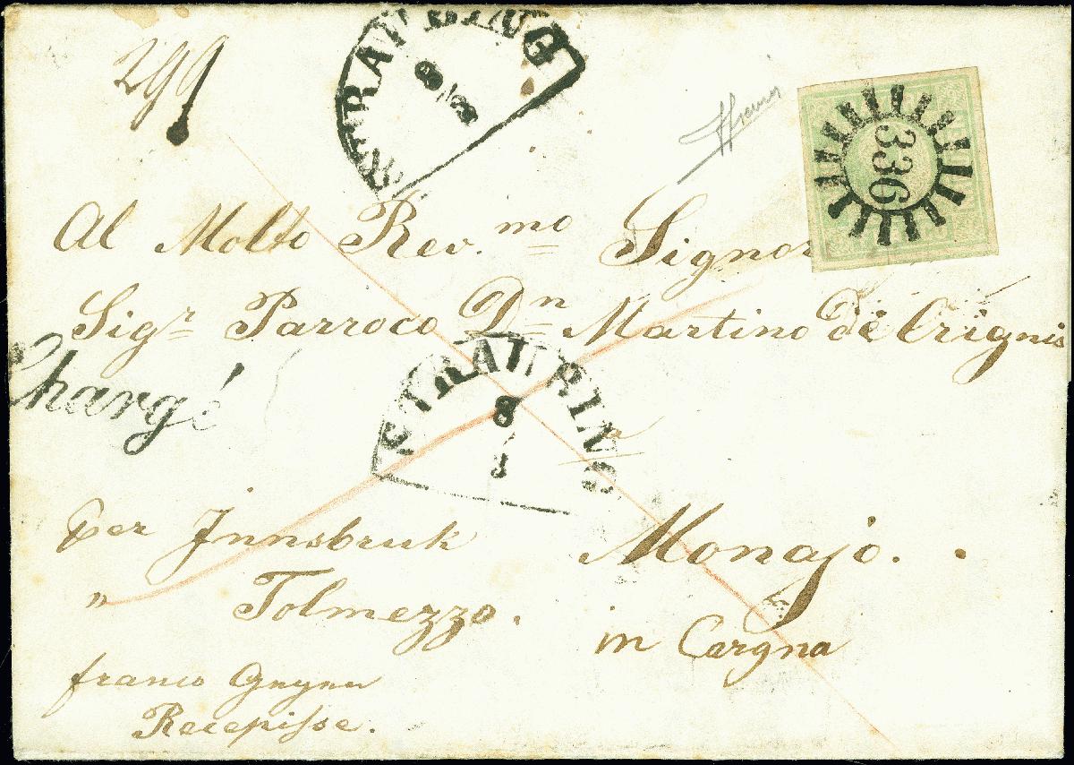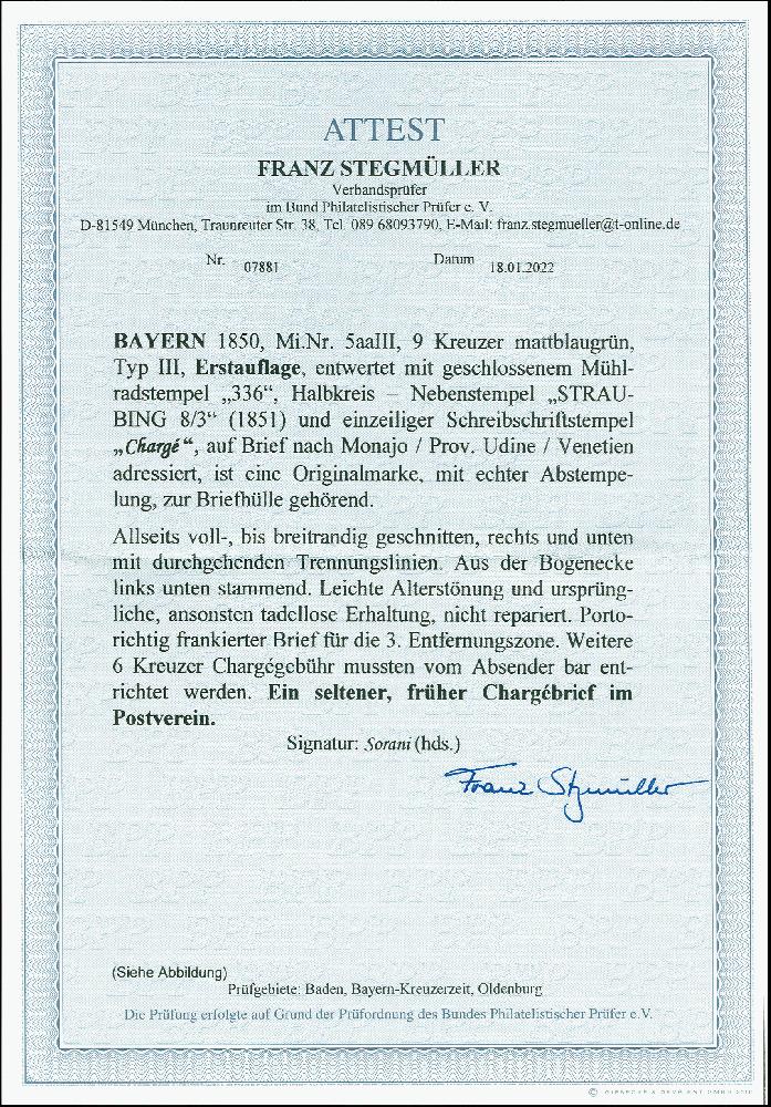 | Zusatzinformationen und Suchstichworte: | 378. Auktion Heinrich Köhler 21.-26. März 2022 Los 7052 9 Kreuzer mattblaugrün, Type III, farbfrisch und voll-bis breitrandig, aus der linken unteren Bogenecke stammend, mit klar- und zentrisch aufgesetztem gMR „336“ und nebengesetztem Halbkreis „STRAUBING 8/3“ (1851) auf komplettem Charge-Brief mit handschriftlichem Vermerk „franco gegen Recepisse“nach Monajo in der Provinz Venetien. Bis auf minimale Alterstönung frische und einwandfreie Erhaltung. Ein seltener früher Chargé-Brief im Wechselverkehr mit Lombardei-Venetien. Fotoattest Stegmüller BPP (2022) Zuschlag 600,00 EUR |