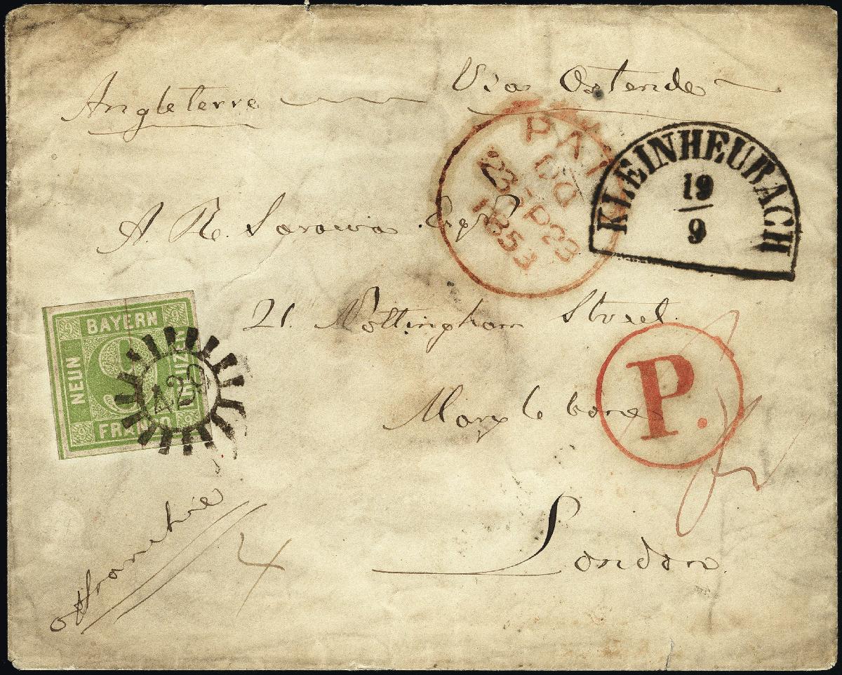| Zusatzinformationen und Suchstichworte: | 378. Auktion Heinrich Köhler 21.-26. März 2022 Los 7055 1850/58, 9 Kreuzer gelblichgrün, allseits breitrandig und farbfrisch mit klarem gMR "429" und sauber nebengesetztem Halbkreis "KLEINHEUBACH 19/9" (1853) auf Briefhülle nach London mit Transitstempeln der Bahnpost Koblenz/Coeln und Coeln/Verviers sowie Ankunftsstempel. Der Brief war mit 23 Kreuzern voll bezahlt, jedoch nur die Postvereinsgebühr mit Marke verklebt; das Weiterfranko mit "14" Kreuzern rück- bzw."4" Silbergroschen vorderseitig notiert. Das Kuvert etwas unfrisch, sonst einwandfrei. Ein attraktiver und seltener Auslandsbrief mit ‚geteiltem Franko‘. Fotoattest Brettl BPP (1997) Zuschlag 1.500,00 EUR |