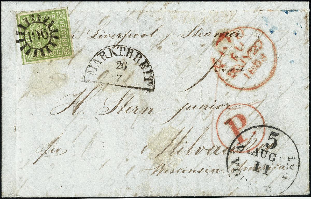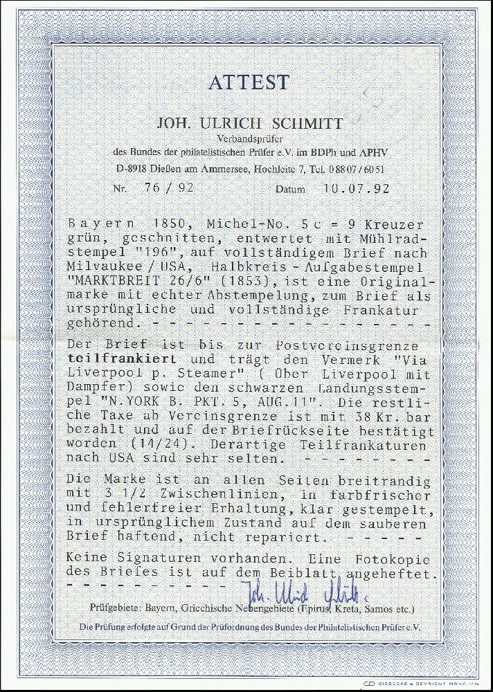 | Zusatzinformationen und Suchstichworte: | 378. Auktion Heinrich Köhler 21.-26. März 2022 Los 7056 9 Kreuzer maigrün, allseits breitrandig und farbfrisch mit gMR "196" und nebengesetztem Halbkreisstempel "MARKTBREIT 26/7" (1853) auf vollständigem Faltbrief über Preußen, Belgien und England nach Milwaukee, USA, vollständig bezahlt mit 47 Kreuzern, davon jedoch lediglich die Postvereinsgebühr verklebt, 38 Kreuzer Weiterfranko rückseitig notiert, aufgeteilt in „14“ Kreuzer für Belgien und England sowie „24“ Kreuzer Seeporto. Ein seltener und attraktiver Transatlantik-Brief mit 'geteiltem Franko', Fotoattest Schmitt BPP Zuschlag 4.500,00 EUR |