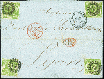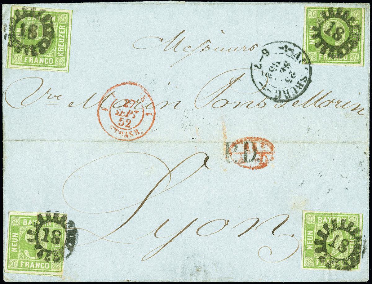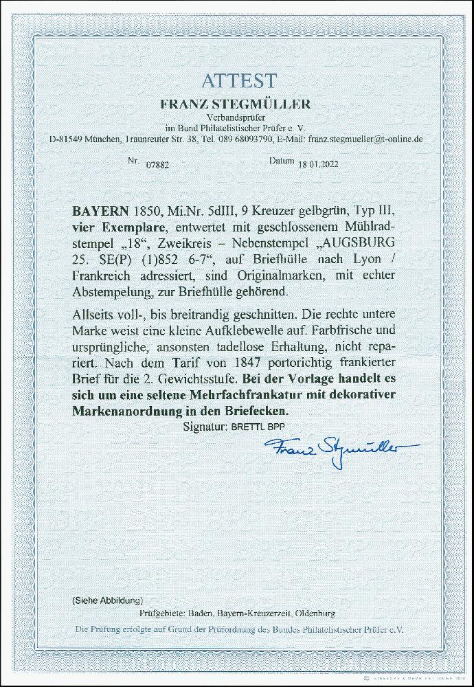 | Zusatzinformationen und Suchstichworte: | 378. Auktion Heinrich Köhler 21.-26. März 2022 Los 7058 9 Kreuzer gelbgrün, Type III, vier Einzelwerte, alle farbfrisch und voll- bis breitrandig, ganz ungewöhnlich geklebt in die vier äußeren Ecken einer Briefhülle der 2.Gewichtsstufe nach Lyon, alle sauber entwertet durch gMR „18“, mit nebengesetztem DKr. „AUGSBURG 25 SEPT.1852“ (leicht auf einen Wert übergehend). Ein Wert kleine Aufkleberwelle, sonst einwandfreie Erhaltung. Eine sehr seltene, und in dieser Form ganz ungewöhnliche Mehrfachfrankatur. Signiert Brettl BPP und Fotoattest Stegmüller BPP (2022) Zuschlag 3.800,00 EUR |