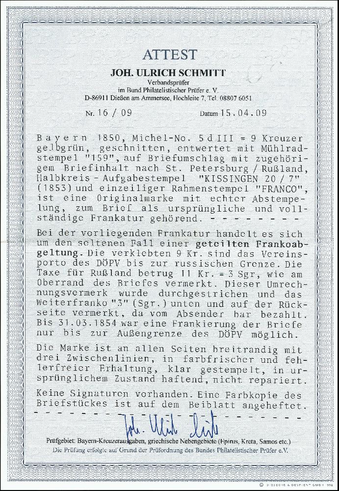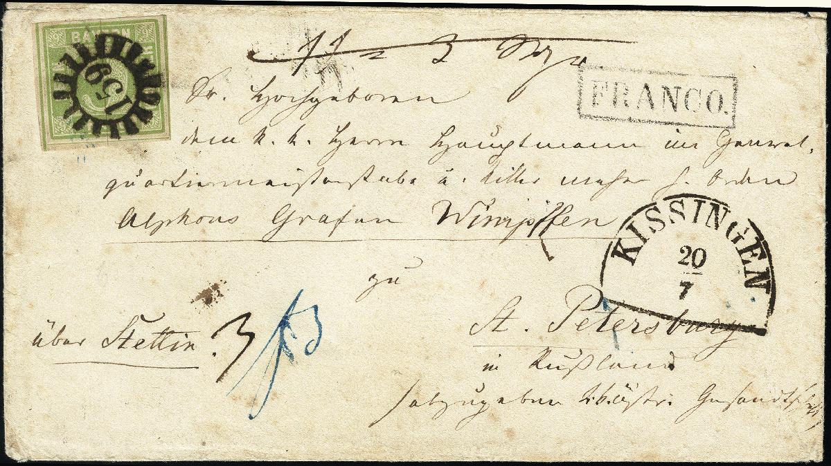 | Zusatzinformationen und Suchstichworte: | 378. Auktion Heinrich Köhler 21.-26. März 2022 Los 7059 1850/58, 9 Kreuzer gelbgrün, farbfrisch und allseits breitrandig mit zentrischem gMR "159" und nebengesetztem Halbkreisstempel "KISSINGEN 20/7" auf Briefkuvert mit Leitvermerk "über Stettin" nach St. Petersburg mit nebengesetztem Ra. "FRANCO". Der Brief ist bis zum Bestimmungsort bezahlt mit 20 Kreuzern, jedoch nur das Vereinsporto verklebt, die übrigen 11 Kreuzer = 3 Silbergroschen als Weiterfranko vorder- und rückseitig notiert; ein attraktiver und seltener Brief mit 'geteiltem Franko'; Fotoattest Schmitt BPP Zuschlag 1.600,00 EUR |