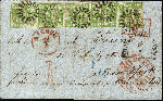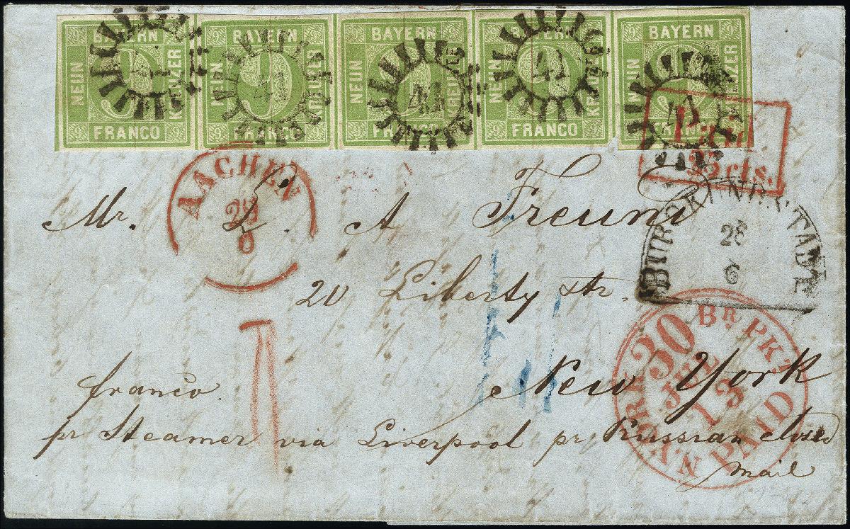 | Zusatzinformationen und Suchstichworte: | 378. Auktion Heinrich Köhler 21.-26. März 2022 Los 7061 9 Kreuzer gelblichgrün im waagerechten 5er-Streifen, dabei die linke Marke in Type I, voll- bis meist breitrandig und sehr schön farbfrisch mit gMR "41" und nebengesetztem Halbkreisstempel "BURGKUNDSTADT 28/6" auf Faltbrief über die 'Prussian Closed Mail' nach New York; teils auf die Frankatur übergehender roter "AACHEN 29/6" und Ra2 "PAID 25 cts.". Ein außerordentlich seltener Streifen auf attraktivem Transatlantik-Brief in sehr schöner Erhaltung, Fotoattest Brettl BPP Zuschlag 7.500,00 EUR |