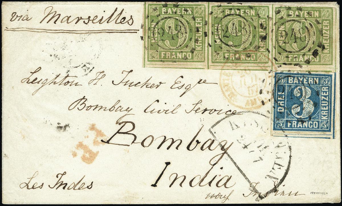 | Zusatzinformationen und Suchstichworte: | 378. Auktion Heinrich Köhler 21.-26. März 2022 Los 7062 1850/58, 9 Kreuzer gelbgrün im waagerechten 3er-Streifen zusammen mit 3 Kreuzer blau, Platte 5, alle farbfrisch und voll- bis meist überrandig, mit leicht und sauber aufgesetztem oMR "248" und teils auf die 3 Kreuzer übergehendem Halbkreisstempel "KISSINGEN 24/7" (1857) auf kleinem Briefkuvert über Frankreich nach Bombay, Indien; teils auf die Frankatur übergehender roter Transitstempel sowie weitere Transit- und Ankunftsstempeln rückseitig. Der Brief war nach dem Tarif von 1847 portogerecht frankiert für einen Brief aus Bayern links des Rheins mit 9 Kreuzern Vereinsporto und 27 Kreuzern Weiterfranko; da Kissingen jedoch rechts des Rheins liegt, war der Brief um 6 Kreuzer unterfrankiert, was jedoch nicht bemerkt wurde; der Brief wurde unbeanstandet befördert und zugestellt. Ein sehr attraktiver früher Brief auf den Subkontinent. Die Heinrich Köhler-Kartei hat nur wenige Briefe der Quadratausgaben nach Indien registriert, jedoch keinen weiteren über Frankreich. Signiert Hartmann und Pfenninger sowie Fotoattest Brettl BPP (2000) Zuschlag 12.000,00 EUR |