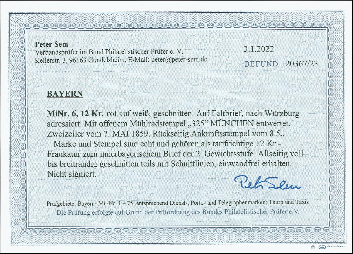 | Zusatzinformationen und Suchstichworte: | 378. Auktion Heinrich Köhler 21.-26. März 2022 Los 7064 12 Kreuzer rot, farbfrisch und voll-bis meist breitrandig, mit oMR „325“ und nebengesetztem Langstempel „MÜNCHEN 7 MAI 1859“ auf Briefhülle der zweiten Gewichtsstufe nach Würzburg, einwandfrei. Fotobefund Sem BPP (2022) Zuschlag 260,00 EUR |