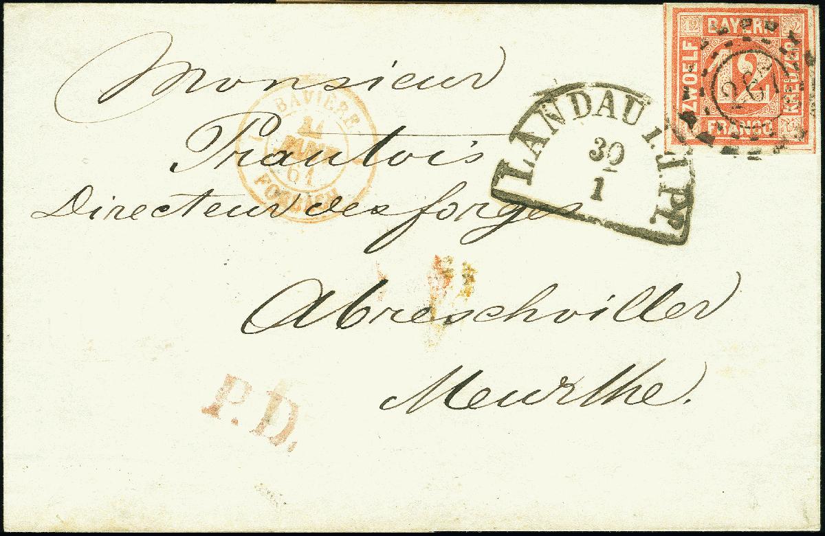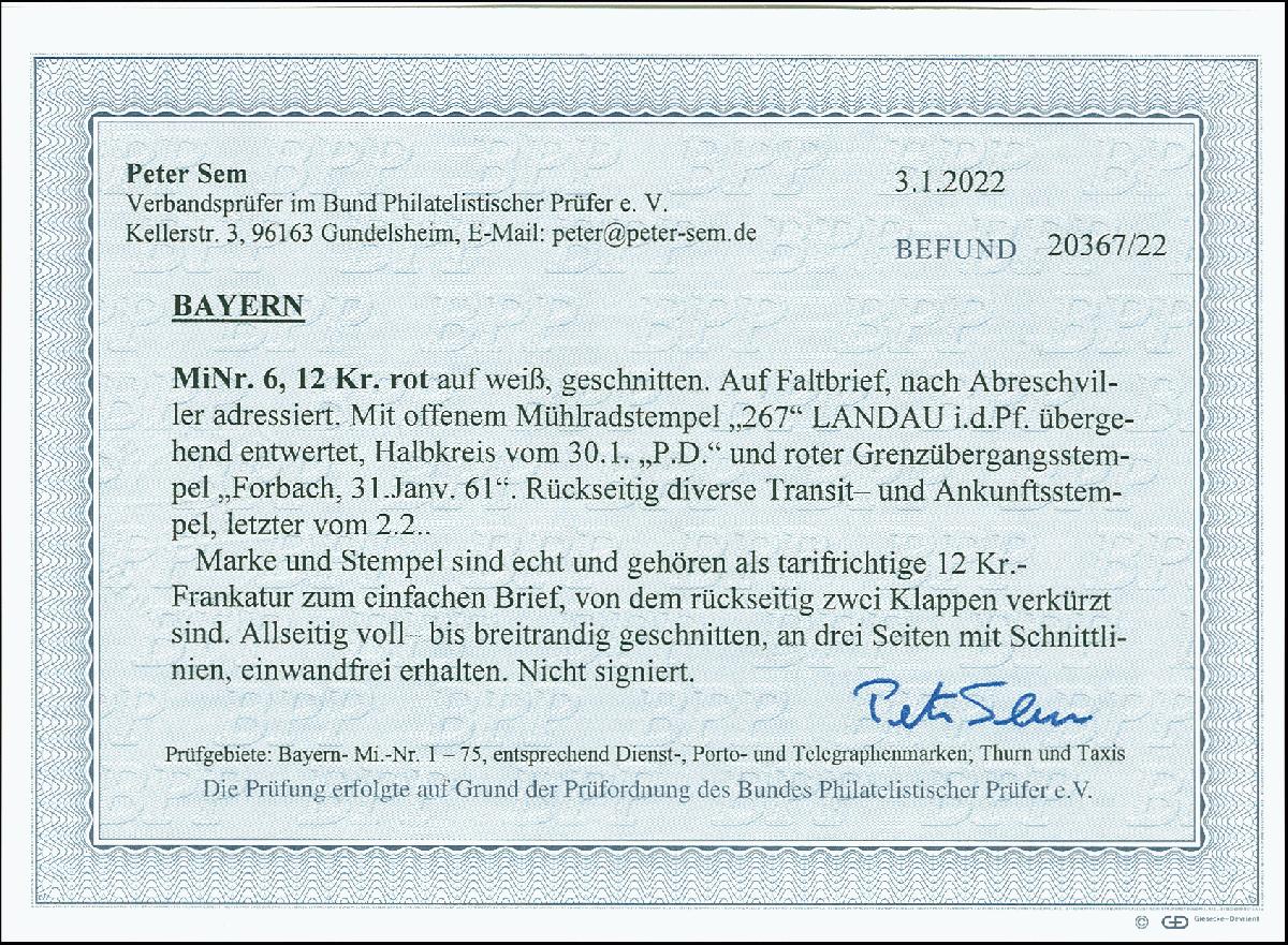 | Zusatzinformationen und Suchstichworte: | 378. Auktion Heinrich Köhler 21.-26. März 2022 Los 7067 12 Kreuzer rot, farbfrisch und voll-bis meist breitrandig, mit oMR „267“ und leicht übergehenden Halbkreis „LANDAU i.d. PF. 30/1“ auf kleiner Briefhülle (zwei Rückklappen verkürzt) nach Frankreich. Schöne einwandfreie Erhaltung. Fotobefund Sem BPP (2022) Zuschlag 380,00 EUR |