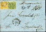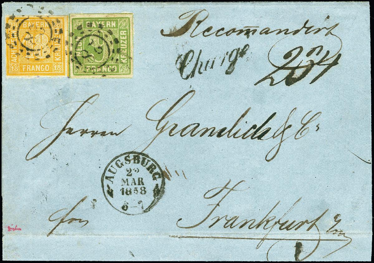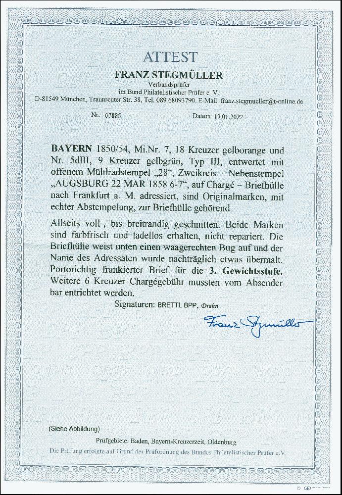 | Zusatzinformationen und Suchstichworte: | 378. Auktion Heinrich Köhler 21.-26. März 2022 Los 7074 1850/54, 18 Kreuzer gelb-orange und 9 Kreuzer gelbgrün, beide farbfrisch und voll-bis breitrandig mit sauberem oMR “28” und nebengesetztem Doppelkreisstempel “AUGSBURG 22 MAR 1858” Auf rekommandierter Briefhülle der 3. Gewichtsstufe nach Frankfurt am Main, Die Briefhülle unten waagrechter Brief Bug und rückseitig gering fehlerhaft, die Frankatur tadellos. Eine seltene Frankaturkombination und seltener Brief im Postverein. Signiert Drahn und Brettl BPP, Fotoattest Stegmüller BPP Zuschlag 1.150,00 EUR |