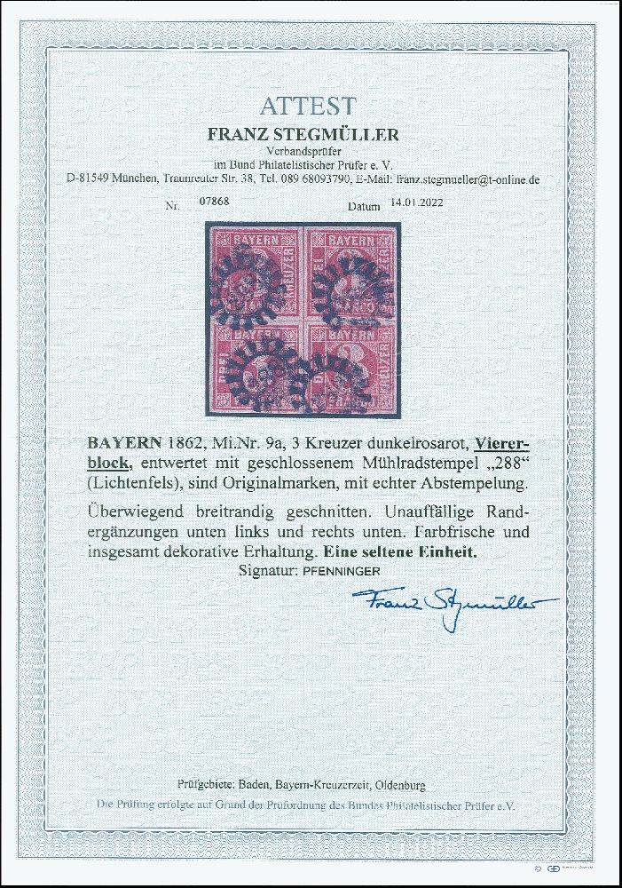 | Zusatzinformationen und Suchstichworte: | 378. Auktion Heinrich Köhler 21.-26. März 2022 Los 7079 1862, 3 Kreuzer dunkelrosarot im Viererblock, farbfrisch und voll-bis breitrandig (im unteren Bereich mit kleinen unauffälligen Randergänzungen), entwertet durch gMR “288” LICHTENFELS . Eine attraktive und seltene Einheit. Signierte Pfenninger und Fotoattest Stegmüller BPP (2022) Zuschlag 650,00 EUR |