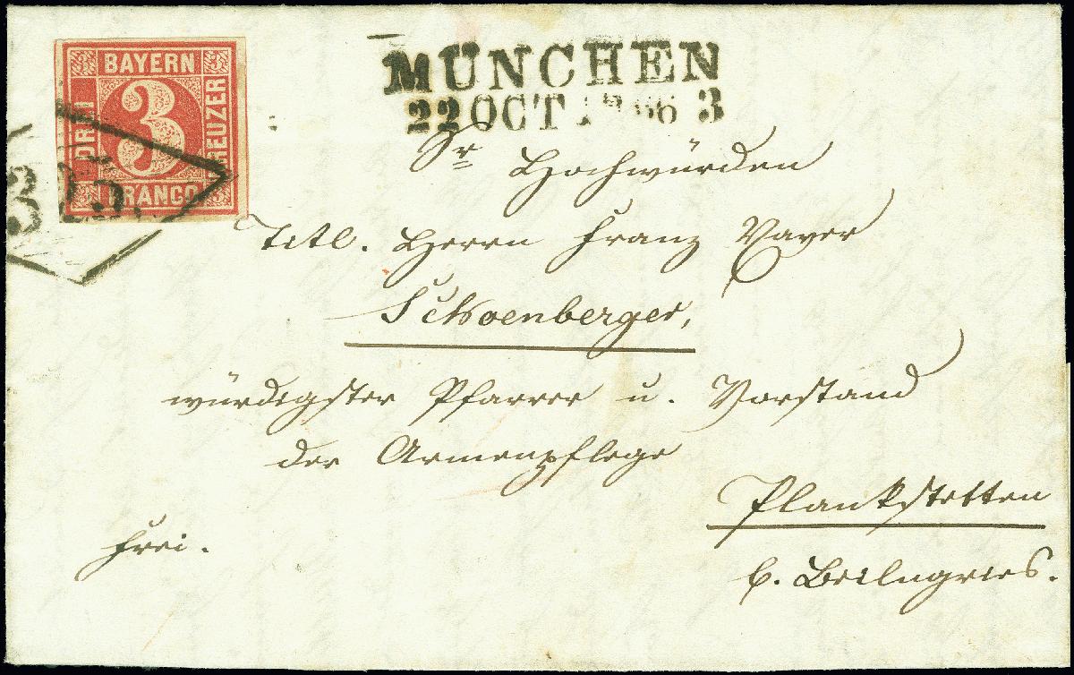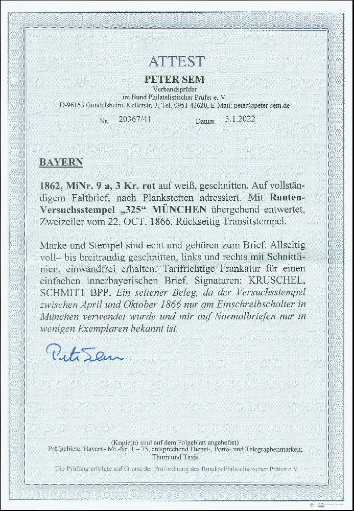 | Zusatzinformationen und Suchstichworte: | 378. Auktion Heinrich Köhler 21.-26. März 2022 Los 7080 3 Kreuzer rot, farbfrisch und voll- bis breitrandig, mit sauber aufgesetztem Rauten-Versuchsstempel „325“ und sauber nebengesetztem Langstempel „MÜNCHEN 22 OCT. 1863“ auf komplettem Faltbrief nach Plankstetten mit Durchgangsstempeln von Pfaffenhofen und Ingolstadt. Kleiner Teil der Rückklappe fehlend, sonst einwandfreie und frische Erhaltung (in der Marke markiert sich eine kleine, vor dem Bedrucken vorhanden gewesene Papierfalte). Ein attraktiver Brief mit dem seltenen Versuchsstempel, der auf Normalbriefen nur in ganz wenigen Fällen bekannt ist. Signiert Kruschel und Schmidt BPP, Fotoattest Sem BPP (2022) Zuschlag 2.500,00 EUR |