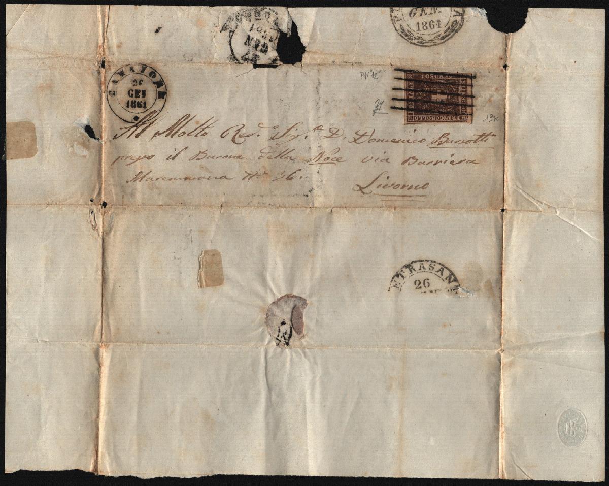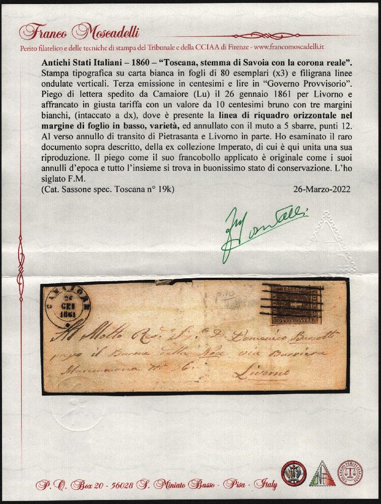 | Zusatzinformationen und Suchstichworte: | Versuch einer Übersetzung: Altitalienische Staaten - 1860 - "Toskana, Wappen von Savoyen mit Königskrone". Typografischer Druck auf weißem Papier in Bogen von 80 Exemplaren (x3) und Wasserzeichen mit vertikalen Wellenlinien. Dritte Ausgabe in Centesimi und Lire der "Provisorischen Regierung". Gefalteter Brief von Camaiore (Lu) am 26. Januar 1861 nach Livorno und korrekt frankiert mit einem Wert von 10 Centesimi braun mit drei weißen Rändern, (rechts eingekerbt), wo sich der horizontale Trennstrich des unteren Blattrandes befindet, Abart, und gestempelt mit stummen 5-Strich-Stempel, 12 Punkte. Rückseitig Durchgangsstempel von Pietrasanta und Livorno teilweise. Ich habe das oben beschriebene seltene Dokument aus der ehemaligen Imperato-Sammlung untersucht, von dem eine Reproduktion hier beigefügt ist. Die Marke und der angebrachte Stempel sind original, ebenso wie die Stempel, und das ganze Set ist in sehr gutem Zustand. Ich habe es mit F.M. signiert. (Kat. Sassone spec. Toskana Nr. 19k) 26. März 2022 |