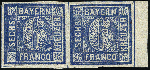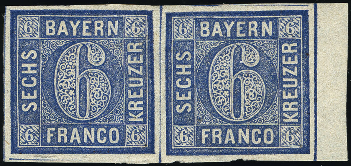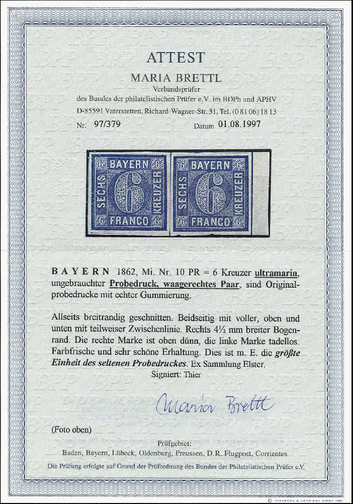 | Zusatzinformationen und Suchstichworte: | 378. Auktion Heinrich Köhler 21.-26. März 2022 Los 7082 1862, 6 Kreuzer ultramarin (statt blau), sogenannter Probedruck im waagerechten Paar, farbfrisch und allseits breitrandig, ungebraucht mit Originalgummi. Die rechte Marke oben kleine falzhelle Stelle, sonst tadellos. Größte bekannte Einheit dieser außerordentlich seltenen Marke; wir haben nur drei weitere Paare registriert. Fotoattest Brettl BPP (1997) Zuschlag 5.000,00 EUR |