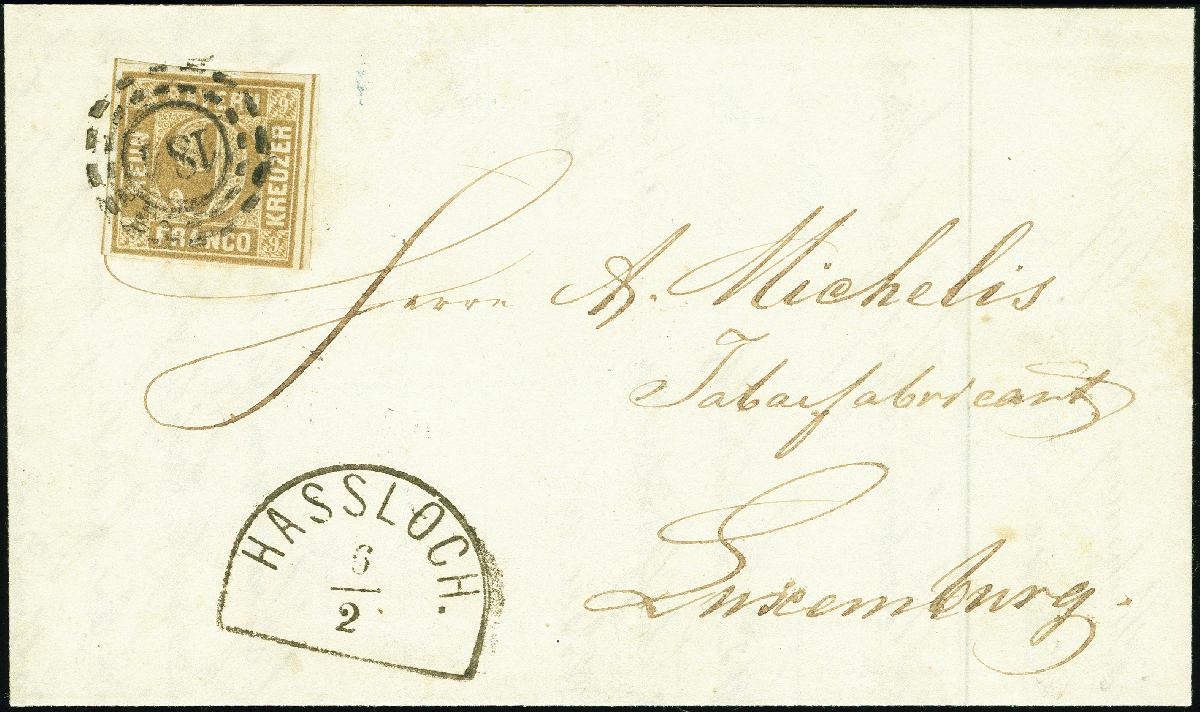 | Zusatzinformationen und Suchstichworte: | 378. Auktion Heinrich Köhler 21.-26. März 2022 Los 7087 1862, 9 Kreuzer ockerbraun, farbfrisch und voll- bis meist breitrandig, teils mit Zwischenlinien, mit sauberem oMR „184“ und klar nebengesetztem Halbkreis „HASSLOCH 6/2“ an den Tabakfabrikanten Michelis in Luxemburg, mit rückseitigem Bahnpoststempel „BINGERBRÜCK/SAARBRÜCKEN“. Ein attraktiver Brief mit seltener Destination im Postverein. Fotoattest Brettl BPP (2000) Zuschlag 1.100,00 EUR |