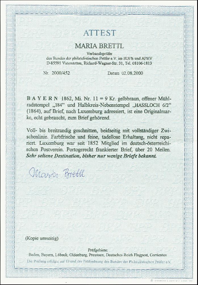 | Prüfer: | Brettl, Maria (BPP (Bund Philatelistischer Prüfer)) |