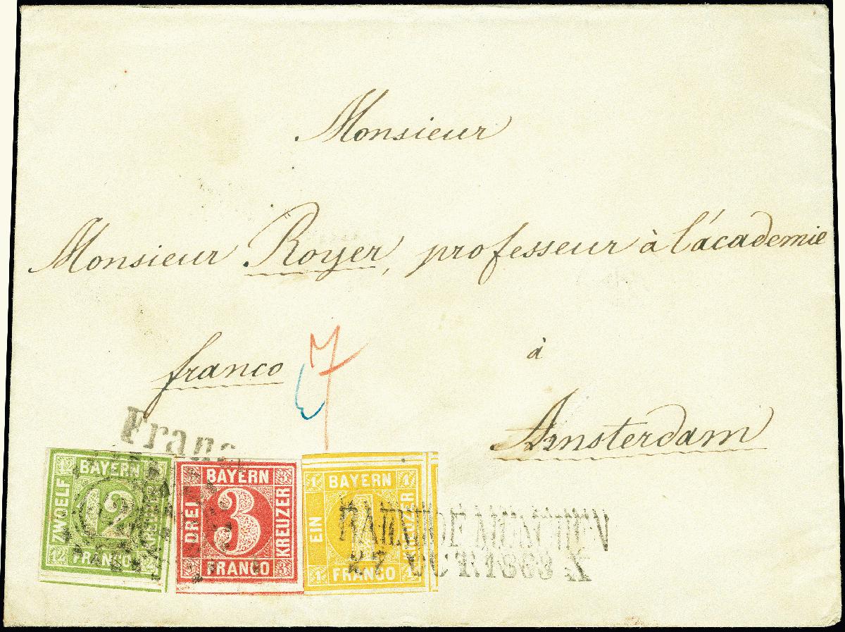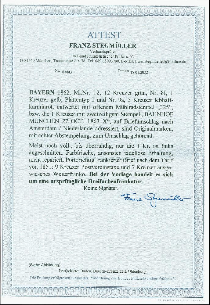| Zusatzinformationen und Suchstichworte: | 378. Auktion Heinrich Köhler 21.-26. März 2022 Los 7088 1862, 12 Kreuzer grün, 3 Kreuzer lebhaftkaminrot und 1 Kreuzer gelb, letztere links etwas angeschnitten, sonst alle voll-bis sehr breitrandig, die 1 Kreuzer mit Teilen von drei Nachbarmarken, und alle in schöner frischer Farbe, mit oMR “325” bzw. die 1 Kreuzer mit Langstempel “BAHNHOF MÜNCHEN 27 OCT 1863” auf Briefkuvert nach Amsterdam mit “7” Kreuzern ausgewiesenem Weiterfranko. Rückseitig Bahnpost- und Ankunftsstempel. Eine seltene und attraktive Farbfrankatur mit seltener Duplex-Entwertung und in einwandfreier, ursprünglicher Erhaltung. Zuschlag 3.400,00 EUR |