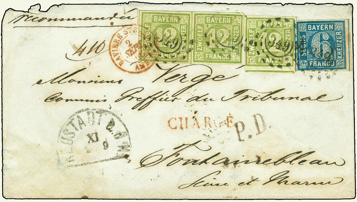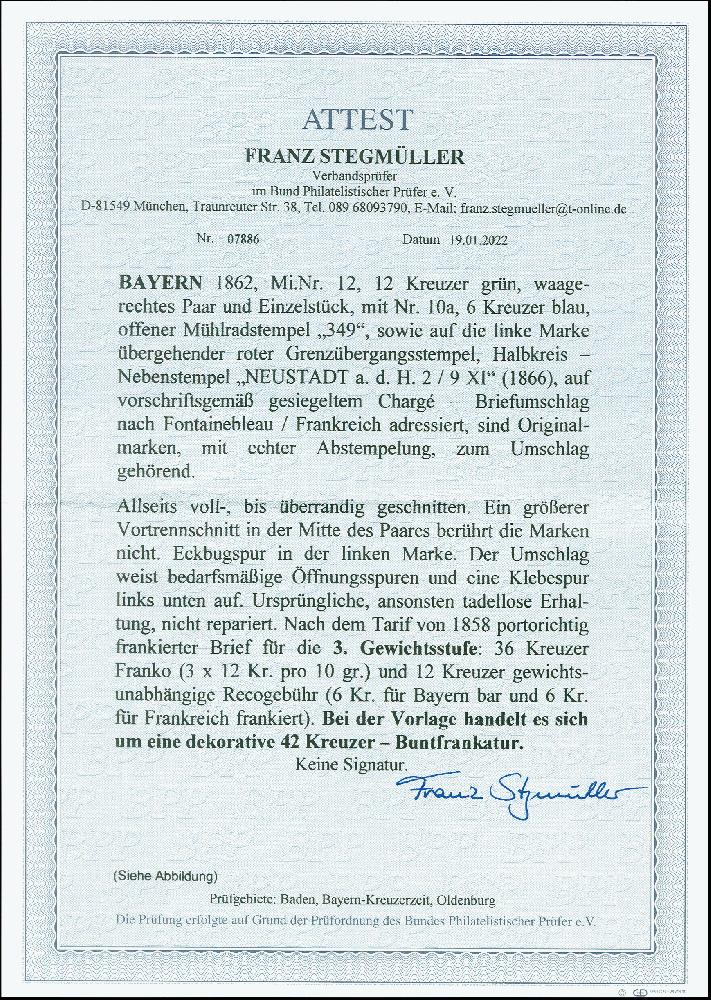 | Zusatzinformationen und Suchstichworte: | 378. Auktion Heinrich Köhler 21.-26. März 2022 Los 7089 1862, 12 Kreuzer grün, waagerechtes Paar und Einzelstück, zusammen mit 6 Kreuzer blau, alle farbfrisch und voll-bis überrandig geschnitten (ein größerer Vortrennschnitt in der Mitte des Paares berührt die Marken nicht), mit oMR “349” und auf einen Wert übergehenden roten Transitstempel sowie nebengesetzem Halbkreis “NEUSTADT a.d.H. 2/9” (1866), auf gesiegeltem Chargé-Kuvert der 3. Gewichtsstufe nach Frankreich. Das Porto setzt sich zusammen aus 3 mal 12 Kreuzern Porto (je 10g) sowie 6 Kreuzern Französischer Recogebühr; weitere 6 Kreuzer bayerische Recogebühr wurden bar bezahlt und über den Postschein verrechnet. Das Kuvert ist etwas rau geöffnet und zeigt links unten eine unauffällige Klebespur, sonst einwandfreie und sehr schöne Erhaltung. Eine außerordentlich seltene Auslands-Frankatur. Zuschlag 4.600,00 EUR |