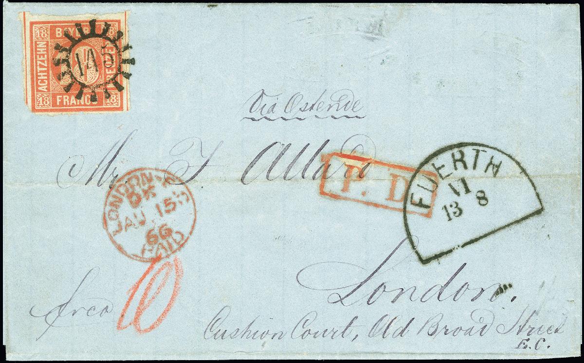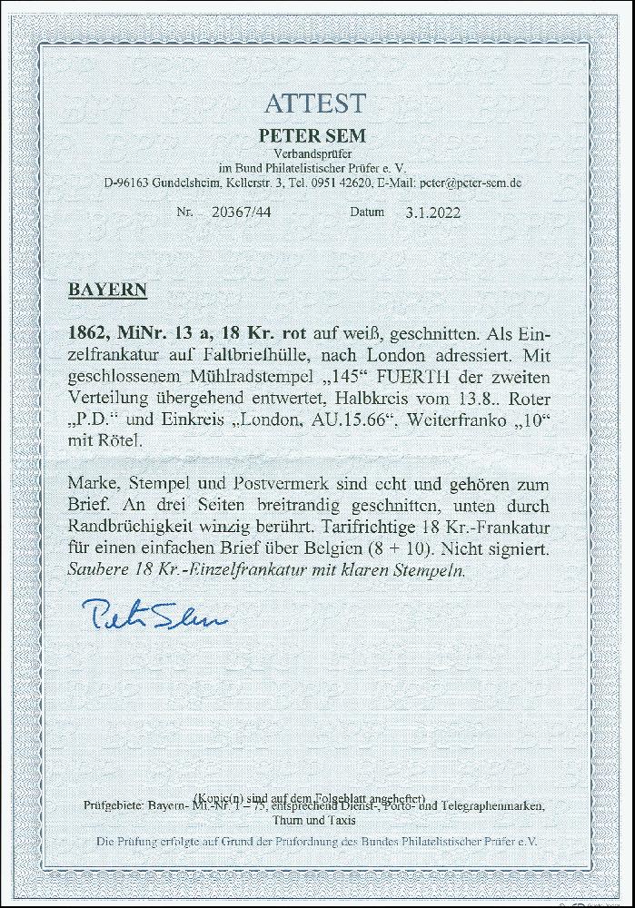 | Zusatzinformationen und Suchstichworte: | 378. Auktion Heinrich Köhler 21.-26. März 2022 Los 7090 18 Kreuzer zinnoberrot, sehr schön farbfrisch, unten bayernbrüchig und dadurch dort teils gering berührt, sonst breitrandig, seitlich mit vollen Zwischenlinien, mit klar aufgesetztem gMR „145“ und sauber nebengesetztem Halbkreis „FUERTH 13 8“ (1866) auf Briefhülle über Belgien nach London. . Ein attraktiver und sonst einwandfreier Auslandsbrief mit seltener Einzelfrankatur. Fotoattest Sem BPP (2022) Zuschlag 900,00 EUR |