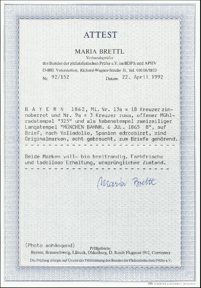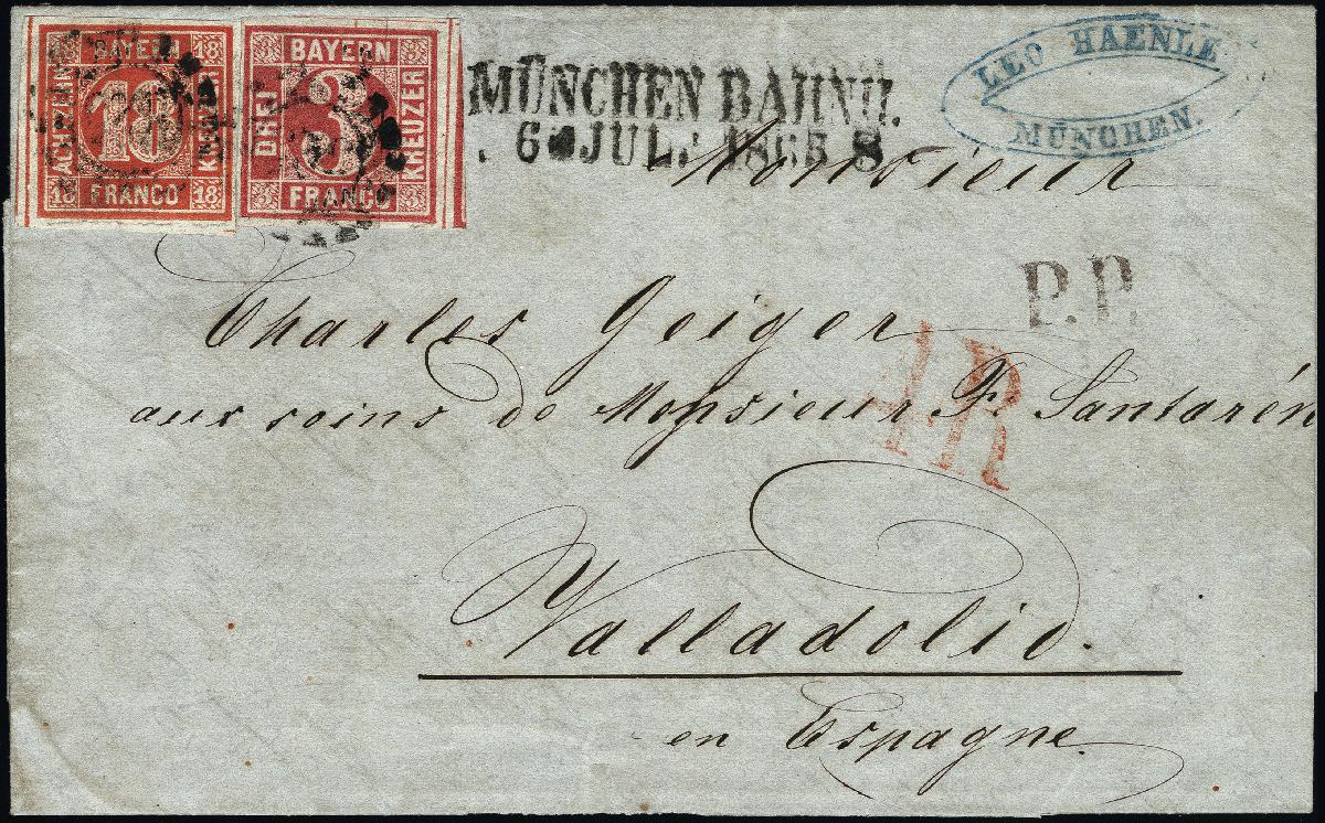 | Zusatzinformationen und Suchstichworte: | 378. Auktion Heinrich Köhler 21.-26. März 2022 Los 7092 18 Kreuzer zinnoberrot und 3 Kreuzer rosa, voll- bis breitrandig und farbfrisch mit gMR "325" und sauber nebengesetztem L2 "MÜNCHEN 6 JUL. 1865" auf komplettem Faltbrief (rückseitiges Siegel ausgeschnitten) nach Valladolid, Spanien. Der Brief ist portogerecht frankiert nach dem Tarif vom 1.7.1864 mit 7 Kreuzern Vereinsporto und 14 Kreuzern Weiterfranko. Das spanische Inlandsporto in Höhe von "4 Rs." wurde vom Empfänger eingezogen. Ein attraktiver Brief mit seltener Destination. Fotoattest Brettl BPP (1992) Zuschlag 2.600,00 EUR |