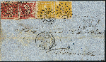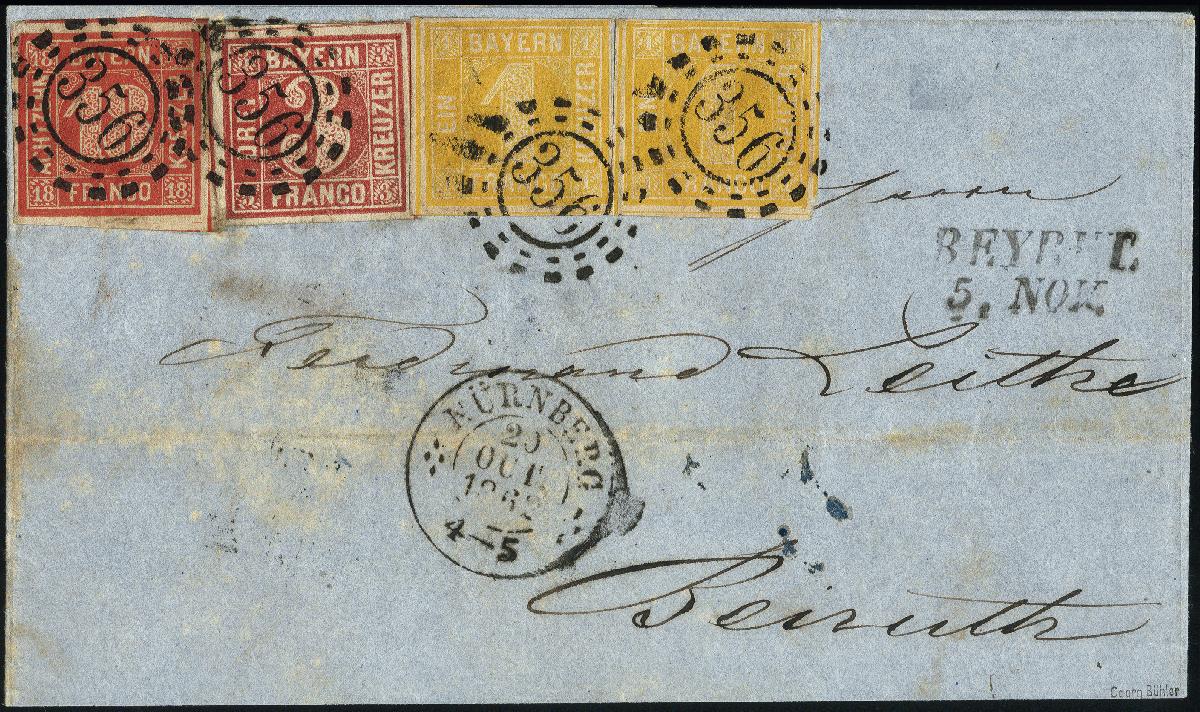 | Zusatzinformationen und Suchstichworte: | 378. Auktion Heinrich Köhler 21.-26. März 2022 Los 7093 18 Kreuzer zinnoberrot, drei Kreuzer rosa und zwei Einzelwerte 1 Kreuzer gelb, die rechts klebende Marke oben Randlinienschnitt, sonst alle voll-bis meist breitrandig und farbfrisch, mit gMR "356" und sauber nebengesetztem DKr. "NÜRNBERG 20 OCT. 1862" auf Briefhülle über Wien und Triest nach Beirut mit vorderseitigem Ankunftsstempel des österreichischen Postamtes. Der Brief ist portogerecht frankiert nach dem Tarif von 1862 mit 9 Kreuzern Vereinsporto und 14 Kreuzern Seeporto von Triest nach Beirut, rückseitig notiert als ‘20‘ Neukreuzer. Außerhalb der Frankatur etwas Patina, sonst für diese Destination gute und durchaus attraktive Erhaltung. Briefe der Quadratausgabe in die Levante sind außerordentlich selten, nach Beirut haben wir keinen weiteren registriert. Signiert Georg Bühler und Fotoattest Brettl BPP (2000) Zuschlag 3.000,00 EUR |