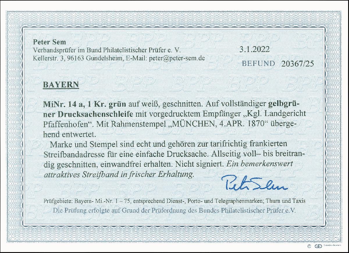 | Zusatzinformationen und Suchstichworte: | 378. Auktion Heinrich Köhler 21.-26. März 2022 Los 7094 1 Kreuzer grün, farbfrisch und voll-bis breitrandig mit Rahmenstempel „MÜNCHEN 4 APR. 1870“ auf grünem Streifband mit vorgedruckte Adresse an das Landgericht Pfaffenhofen. Sehr schöne frische und einwandfreie Erhaltung. Fotobefund Sem BPP (2022) Zuschlag 480,00 EUR |