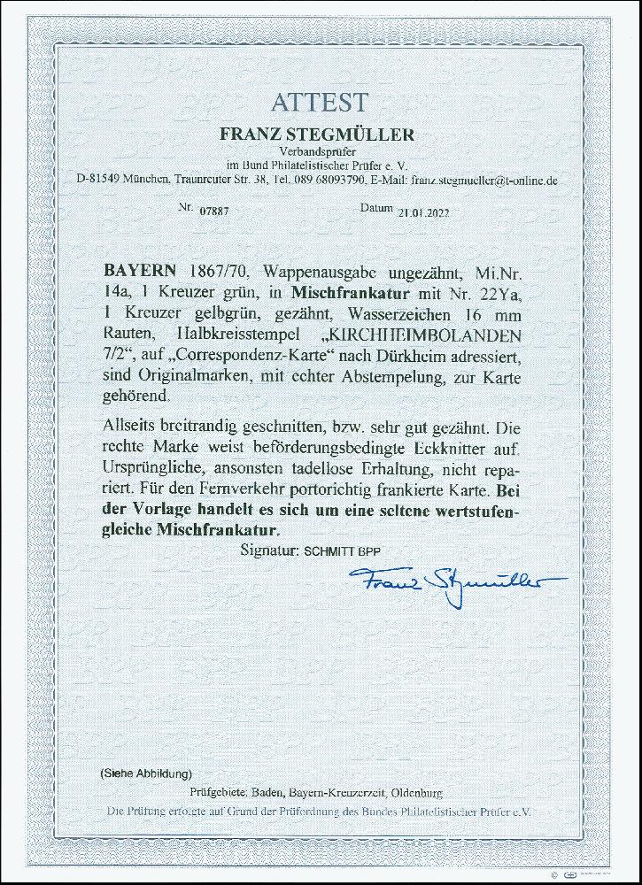 | Zusatzinformationen und Suchstichworte: | 378. Auktion Heinrich Köhler 21.-26. März 2022 Los 7098 1867, 1 Kreuzer grün, farbfrisch und breitrandig in wertstufengleicher Mischfrankatur mit 1870, gezähnte Ausgabe, 1 Kreuzer gelbgrün, farbfrisch und gut gezähnt, mit doppelt aufgesetztem Halbkreis “KIRCHHEIMBOLANDEN 7/2” auf ‘Correspondenz - Karte’ nach Dürkheim mit Ankunftsstempel. Die geschnittene Marke beförderungsbedingte leichte Eckknitter oben links, sonst einwandfrei (in der Karte unten Bugspur). Eine in dieser Form sehr seltene 2 Kreuzer-Frankatur. Fotoattest Stegmüller BPP (2022) Zuschlag 1.150,00 EUR |