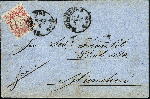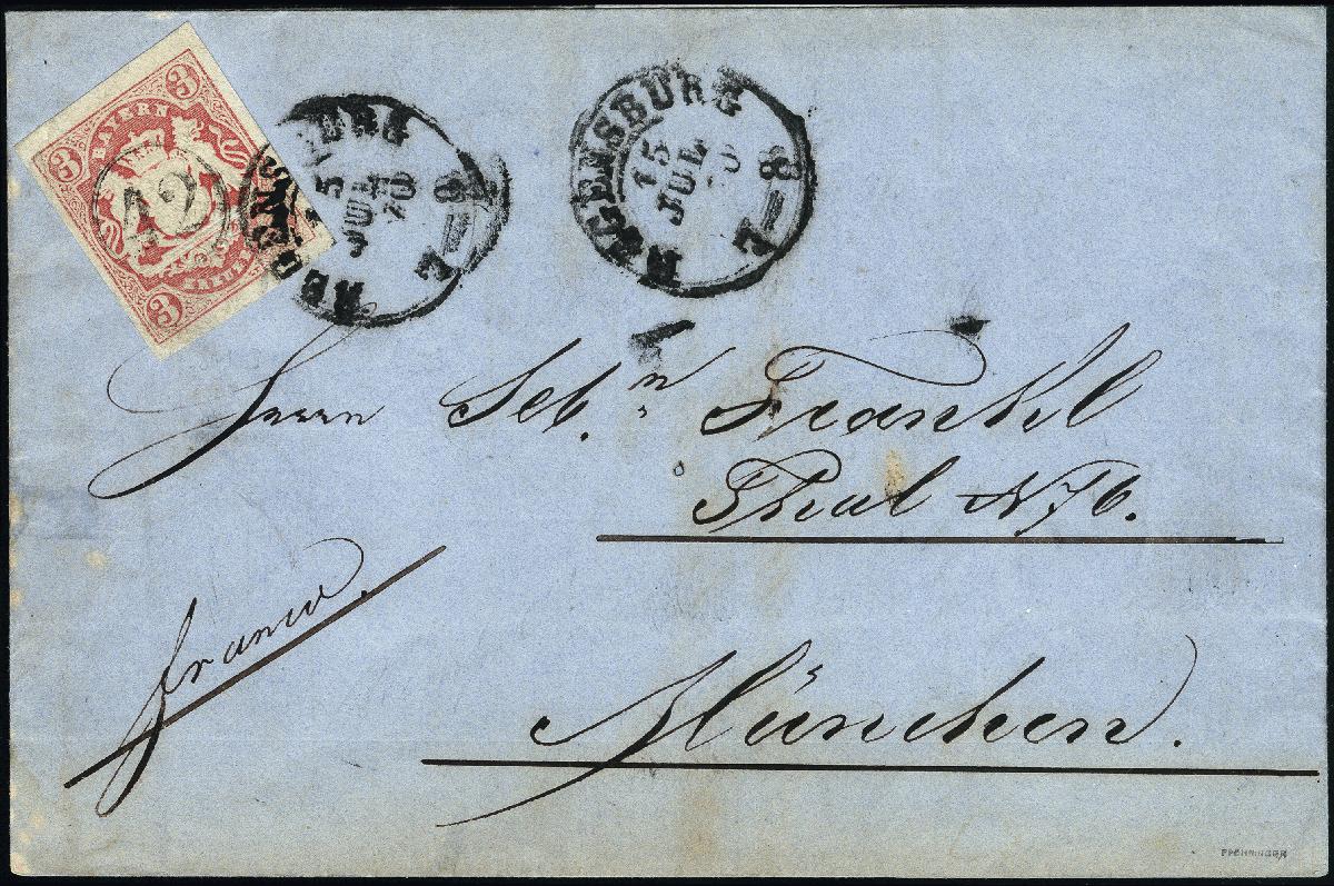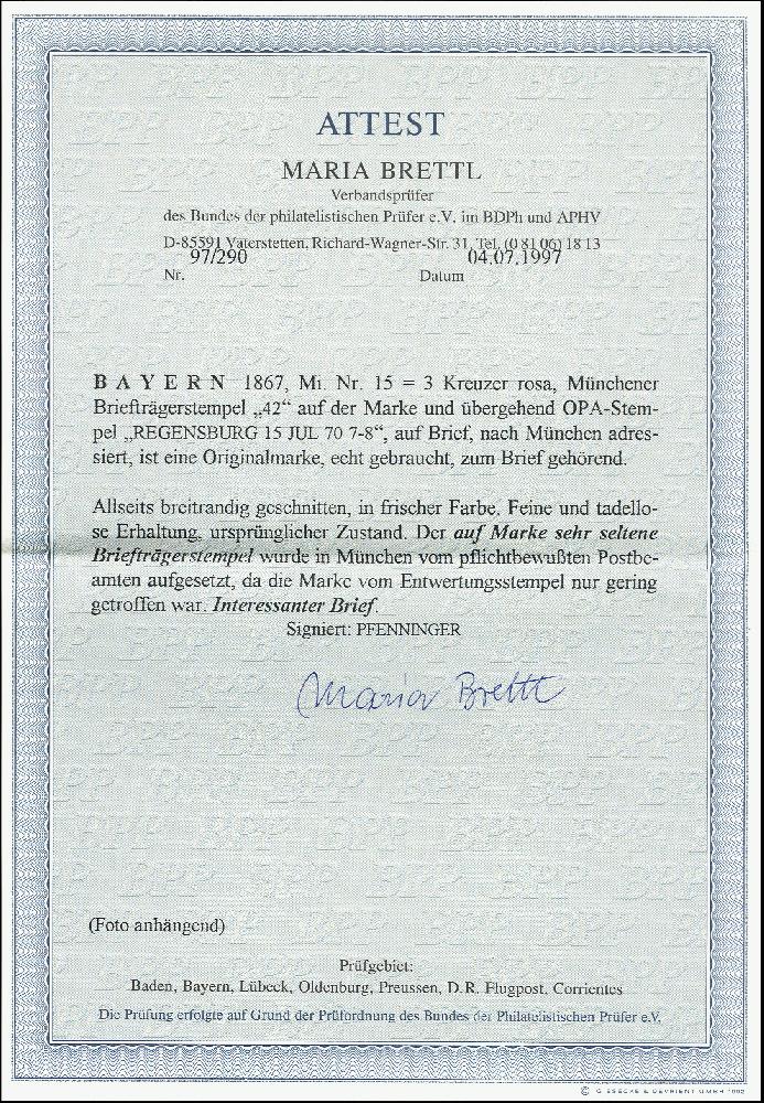 | Zusatzinformationen und Suchstichworte: | 378. Auktion Heinrich Köhler 21.-26. März 2022 Los 7102 1867,3 Kreuzer rosa, voll-bis breitbandig mit fast Motiv frei aufgesetztem DKr. “REGENSBURG 15 JUL 1870“ auf komplettem Faltbrief nach München; aufgrund der nur teilweisen Entwertung der Marke in München nachträglich mit dem Briefträgerstempel „42“ entwertet. Etwas Patina, sonst einwandfrei. Signiert Pfenninger und Fotoattest Brettl BPP (1997) Zuschlag 320,00 EUR |