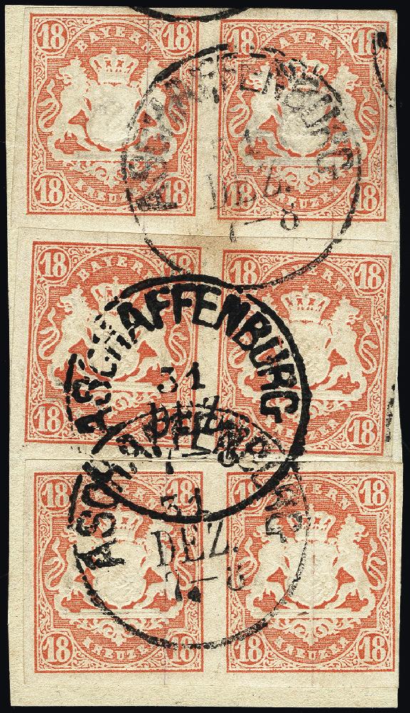 | Zusatzinformationen und Suchstichworte: | 378. Auktion Heinrich Köhler 21.-26. März 2022 Los 7112 1867, Wappen 18 Kreuzer ziegelrot, 3 waagerechte Paare, farbfrisch und meist voll-bis breitbandig, lediglich beim unteren Paar der rechte Rand ergänzt, mit EKr. “ASCHAFFENBURG 31 DEZ.“ auf Briefstück. Das obere Paar unauffällige waagerechte Knitterung und kleine getönte Stelle, sonst einwandfrei. Signiert Pfenninger und Fotoattest Brettl BPP (1999) Ausruf 500,00 EUR |