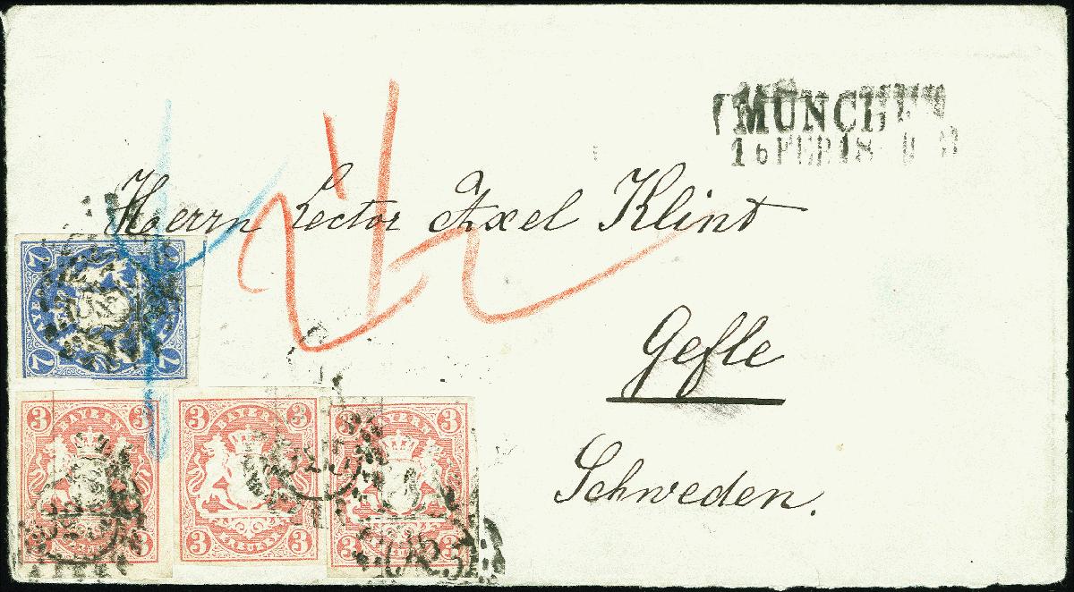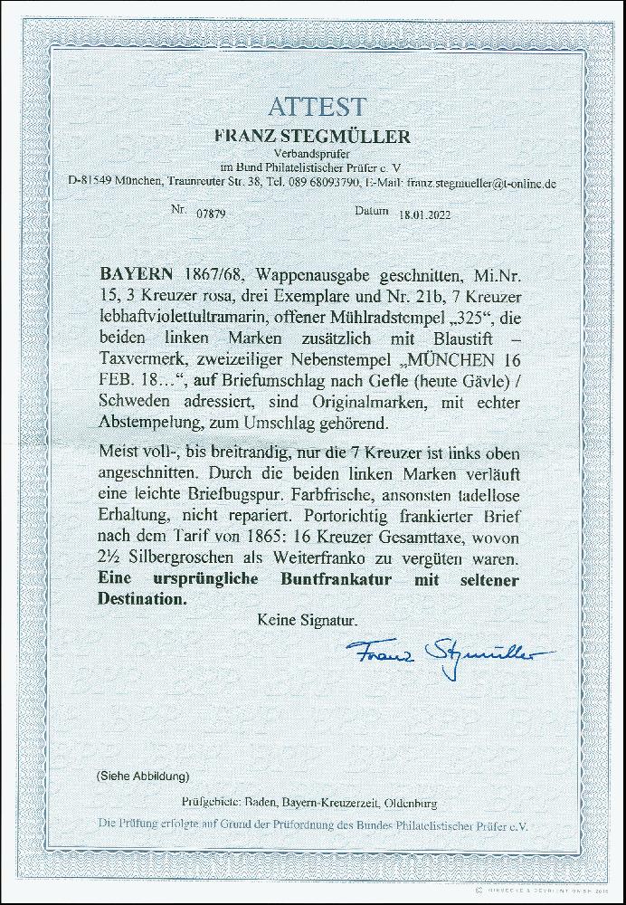 | Zusatzinformationen und Suchstichworte: | 378. Auktion Heinrich Köhler 21.-26. März 2022 Los 7119 1867/68, 7 Kreuzer lebhaftviolettultramarin und drei Einzelwerte 3 Kreuze rosa, die 7 Kreuzer links oben etwas angeschnitten, sonst voll- bis breitandig und farbfrisch, mit oMR “325” und nebengesetztem Langstempel “MÜNCHEN 16 FEB. 18..” auf 3seitig geöffnetem Briefumschlag nach Gefle, Schweden. Die beiden linken Werte leichte Bugspur, sonst gute und frische Erhaltung. Eine sehr seltene Destination. Zuschlag 1.000,00 EUR |
